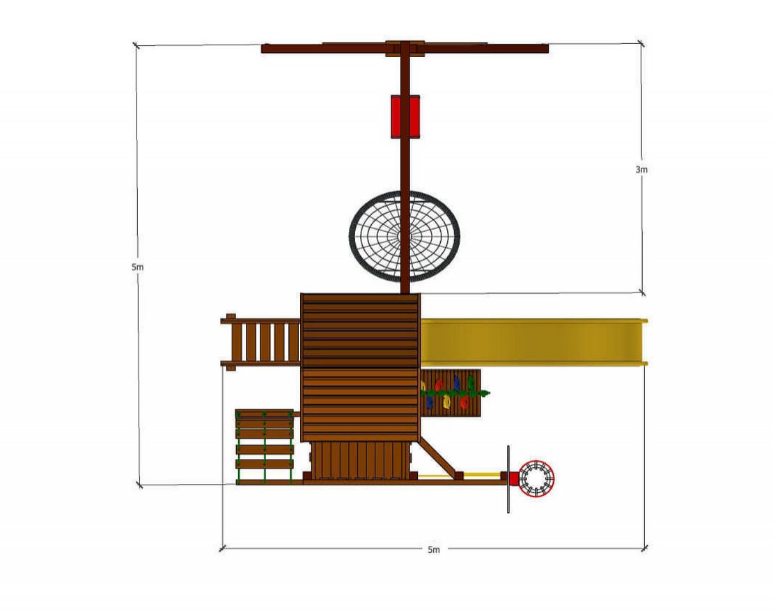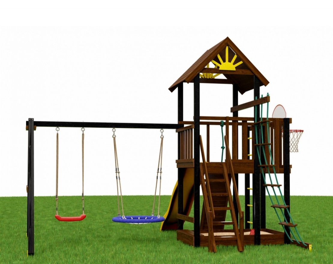 Дети будут в восторге от комплектации. Два вида качелей, горка, баскетбольный щит с кольцом, веревочная лестница и еще более 5 элементов обеспечат незабываемое времяпрепровождение.