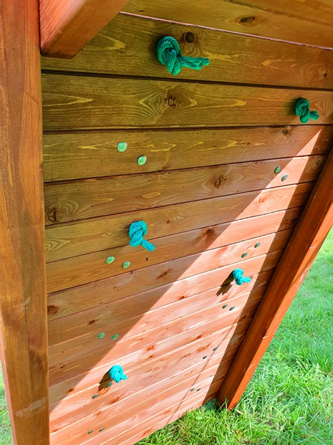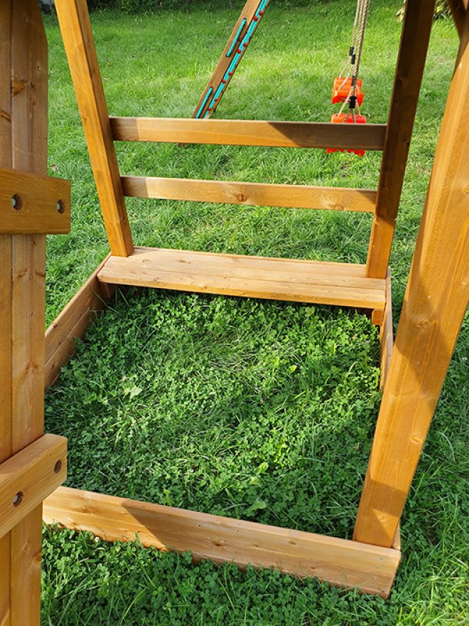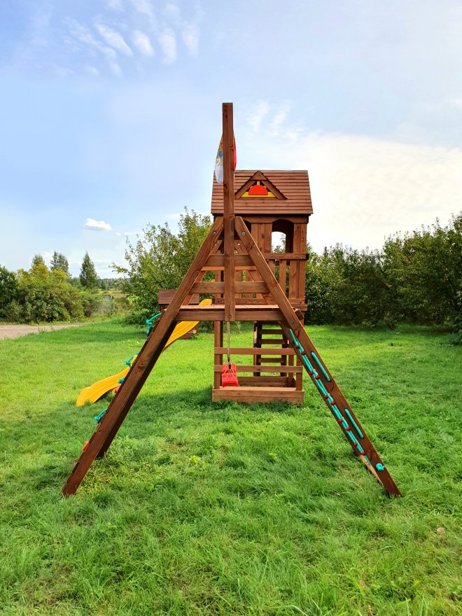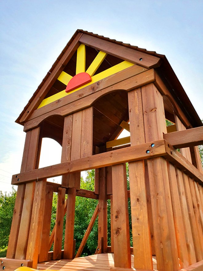 Городок отлично подойдет как для малышей, так и для детей постарше. Малыши могут поиграть в удобной песочнице. Для удобства обустроена лавочка, а для безопасности есть небольшой заборчик, который блокирует случайный выход ребенка из зоны песочницы в сторону качельной балки.