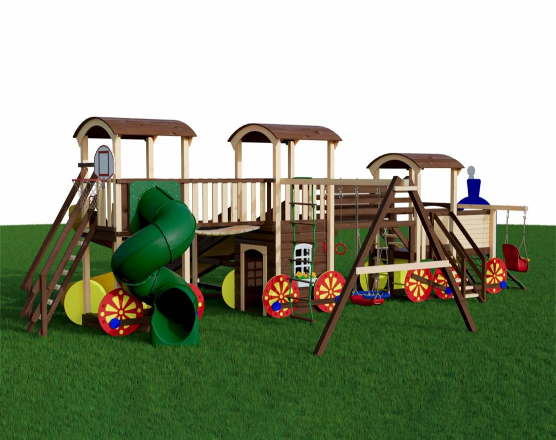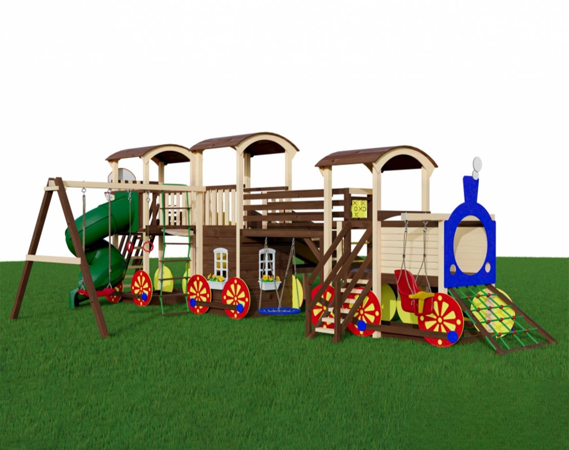 Игровая площадка Рейлроуд 7 предназначена для активного отдыха в летнее и зимнее время. Комплектация представлена многочисленными игровыми модулями: горками, качелями, песочницей. Оригинальная конструкция в виде паровозика полностью реализует потребность детишек в подвижных играх. Цветные детали радуют глаз яркими красками, помогают ориентироваться в многообразии игровых элементов. Деревянные арочные крыши защищают от солнечных лучей или внезапного дождя. Для зимнего отдыха предназначен зимний заливной скат. Деревянные детали тщательно отшлифованы, декоративные элементы выкрашены безопасной для здоровья малышей краской.