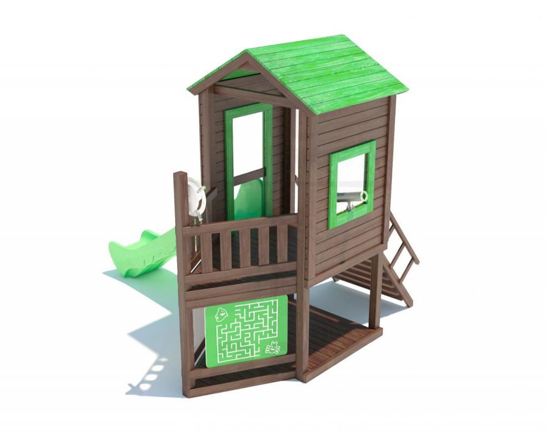 Основа детской игровой конструкции (конструктор) – башня «серия В» с угловым балконом. Конструкция оснащена двускатной деревянной крышей, встроенным домиком, встроенным полом, пластиковыми антивандальным скатом с превосходной скользящей поверхностью, широкой деревянной лестницей, антивандальными пластиковыми игровыми панелями, штурвалом и телескопом. Для безопасности ребенка предусмотрены перила на лестнице, заборчики и ограждения над зонами препятствий (скат).