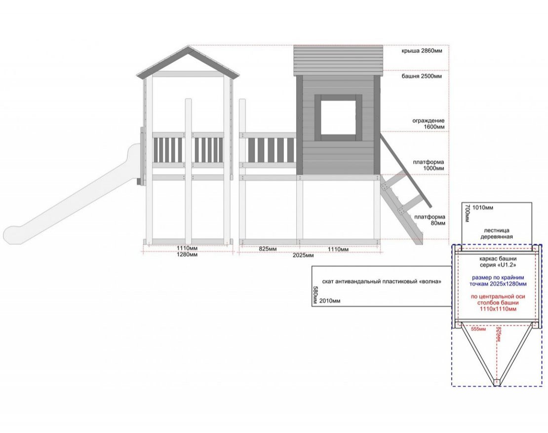 Рекомендованная распределенная единовременная нагрузка: игровая платформа 350кг., деревянная лестница 100кг., скат 150кг.