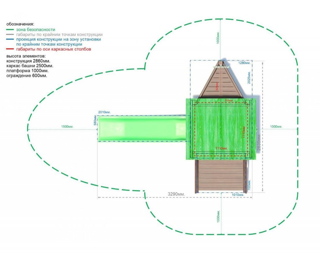 Для безопасной эксплуатации конструкции, площадка должна быть свободна от зеленых насаждений, сооружений и других конструкций, ровная, без перепадов уровня, без впадин и насыпей. Габариты площадки с учетом зоны безопасности длина 5510мм. ширина 4635мм., площадь площадки S-25,5м². Запрещено устанавливать конструкцию в зонах с повышенным риском провалов в грунте (болотистая местность, береговая линия водоемов, в непосредственной близости с оврагами и обрывами).