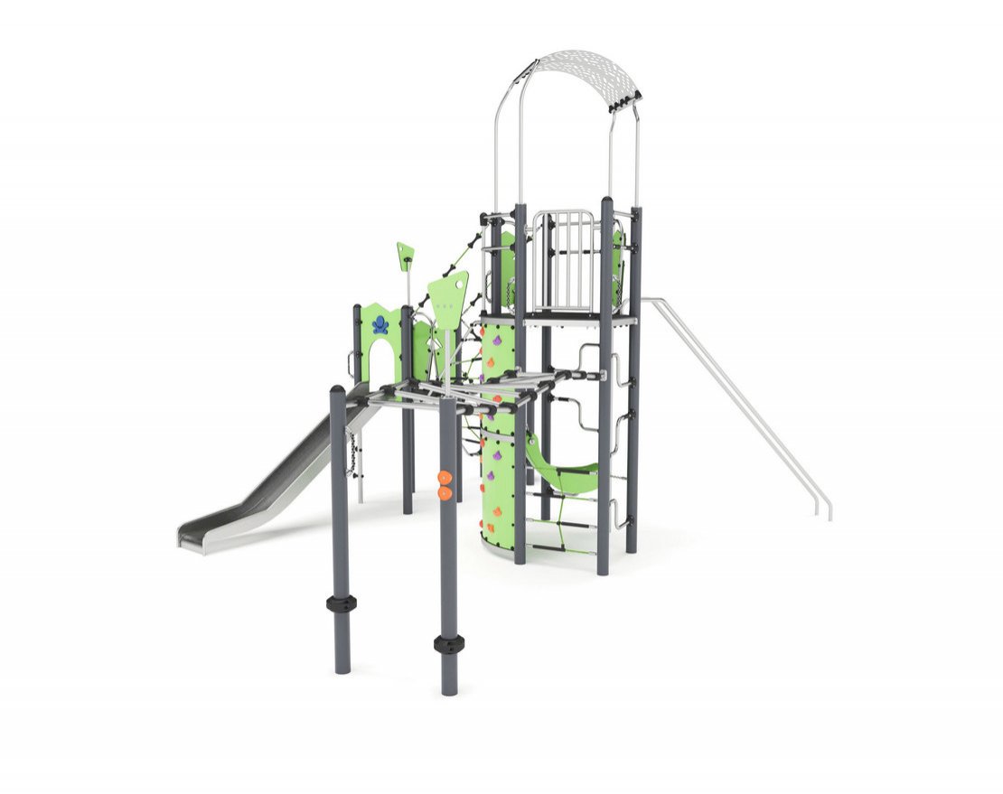 Представляет собой конструкцию, состоящую из элементов, направленных на развитие различных групп мышц. Комплекс оснащен трубами для лазания, канатными сетками, пластиковыми уступами, скалодромной панелью с зацепами и горкой с защитными бортиками.