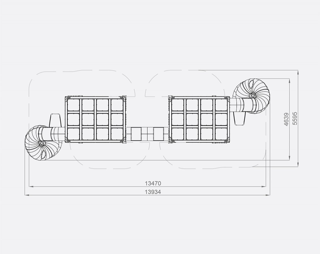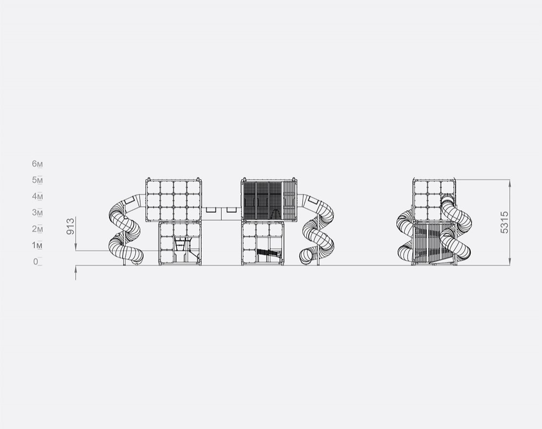 Представляет собой 2 башни, соединенных с помощью металлического тоннельного перехода. Конструкция оснащена двумя тоннельными металлическими горками, канатными сетками и перекладинами.