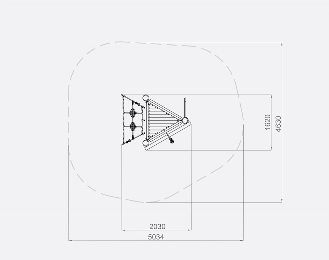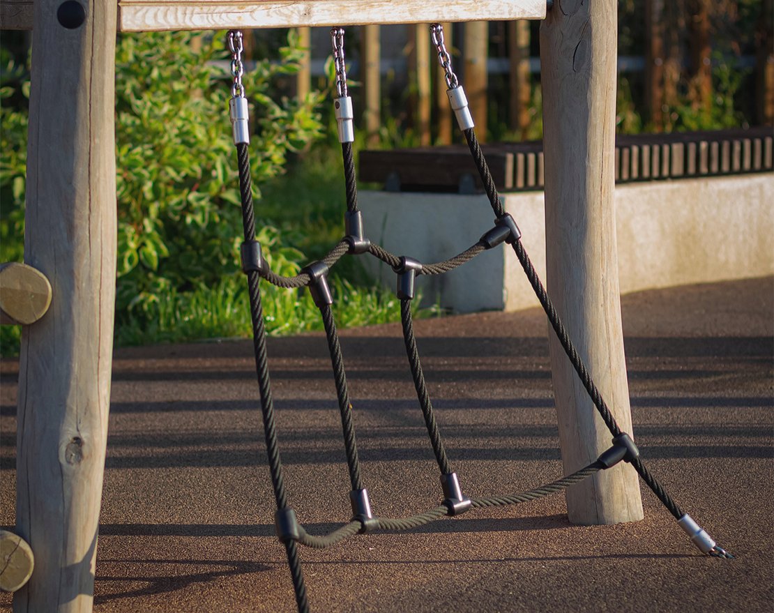 Состоит из опорных стоек, перекладин, металлической трубы-лазалки и канатной сетки. Для большего комфорта, конструкция оснащена пластиковыми уступами и ручками-стропами.