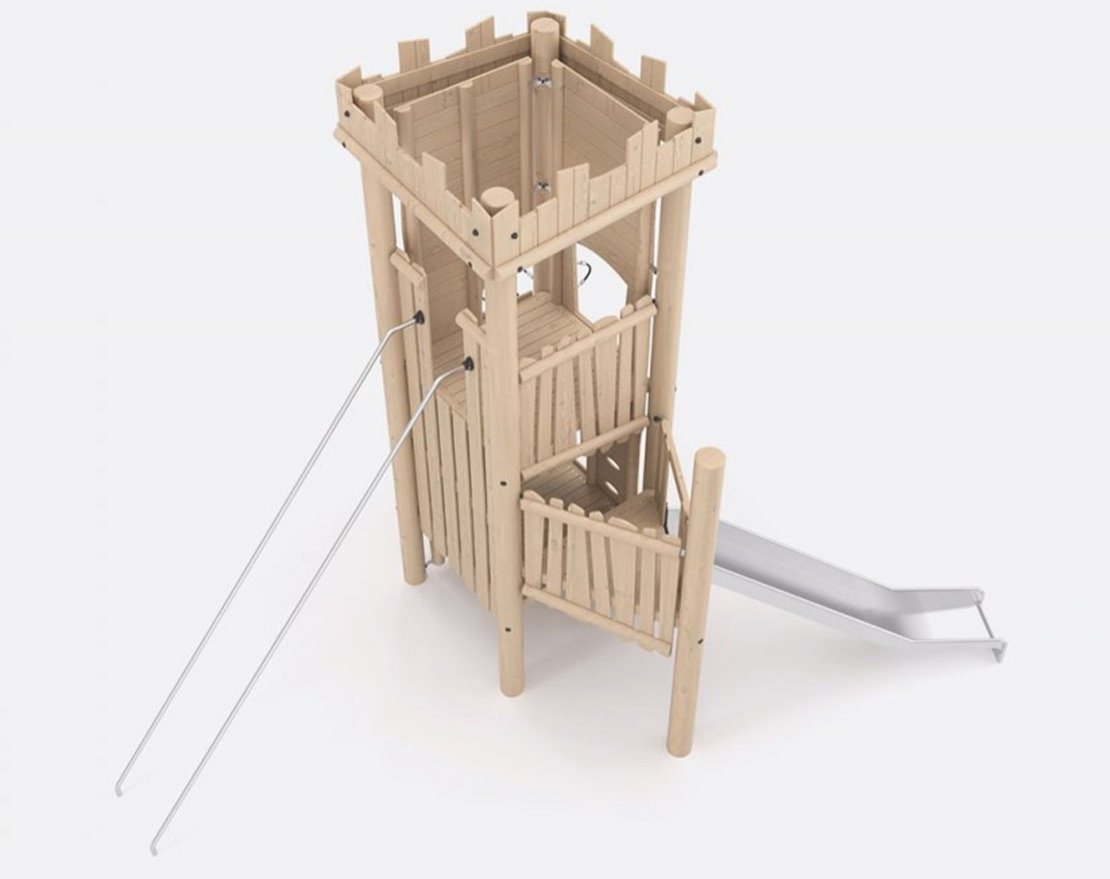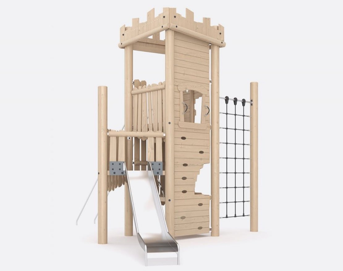 Состоит из опорных стоек, металлических труб-лазалок, канатной сетки и металлической открытой горки с защитными бортиками. Одна стена крепости спроектирована под скалолазную панель — в ней продуманы отверстия для рук и ног. Для большей безопасности и комфорта, конструкция оснащена ручками-стропами.