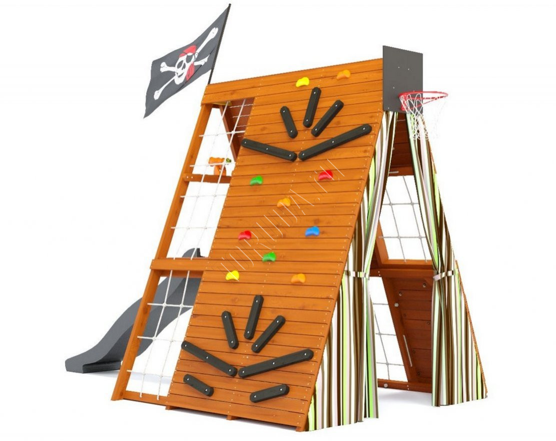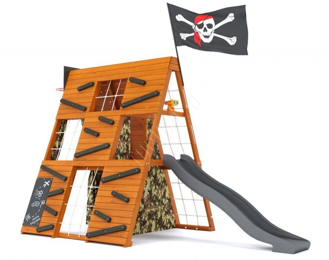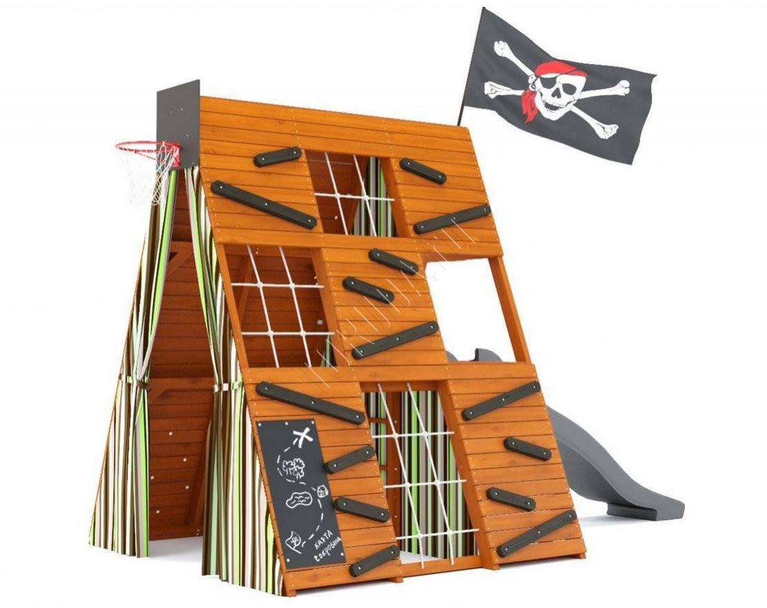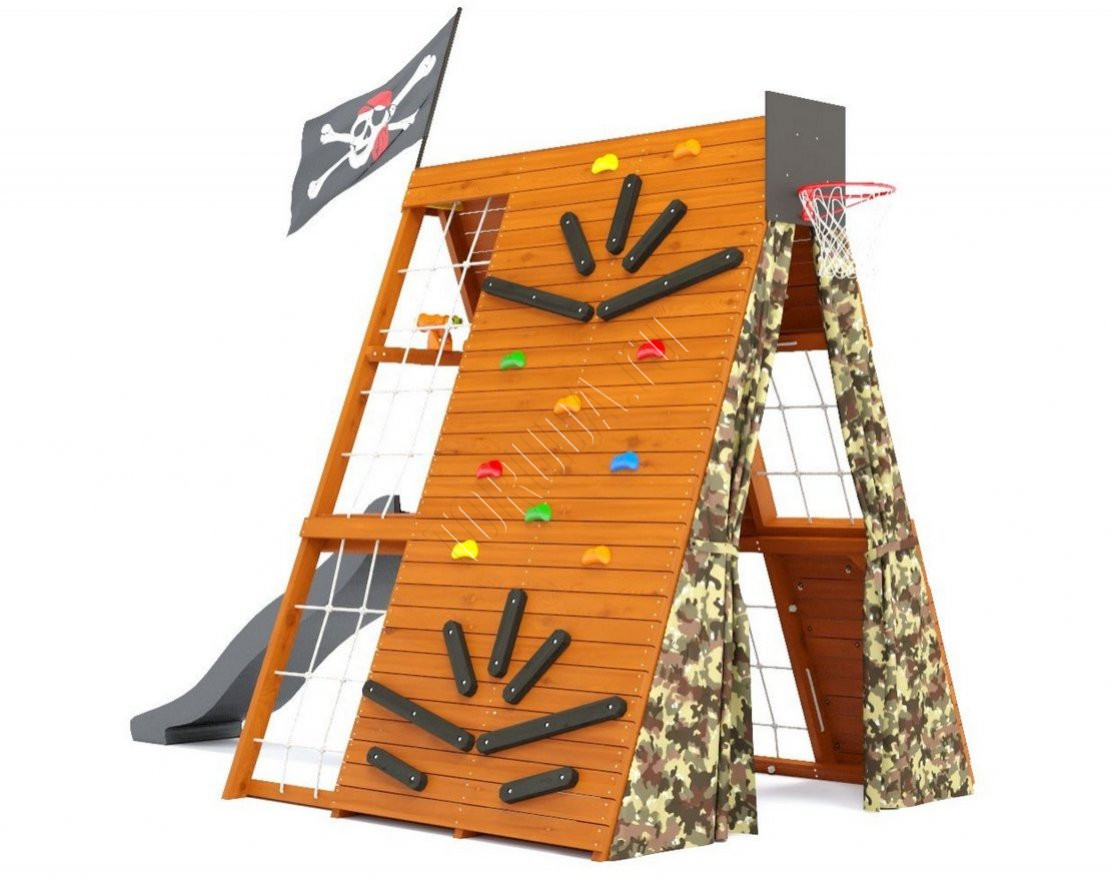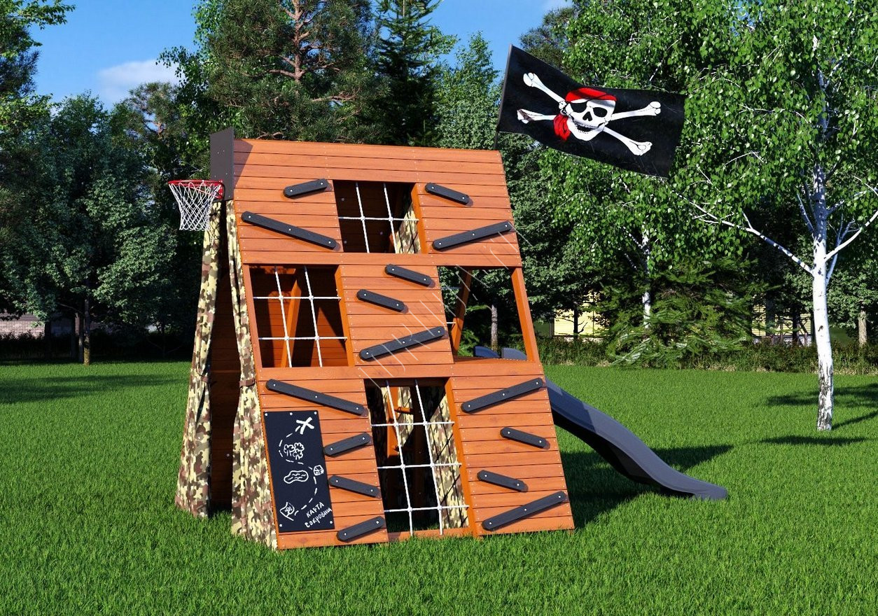В домике есть всё, чтобы создать собственный мир игры и приключений: многосекционный скалодром с пластиковыми и деревянными зацепами, гладиаторские разноуровневые сетки, меловая доска для рисования и творчества, бинокль и даже баскетбольное кольцо со щитом. Внутренний лаз с выходом на платформу и внутренняя лестница - это ещё больше возможностей для детского творчества и активного отдыха.