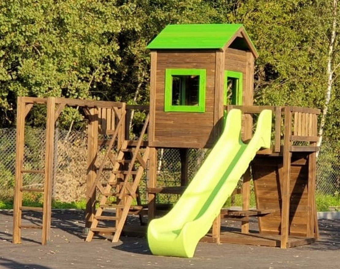 Основа детской игровой конструкции (конструктор) – башня «серия С» с двумя балконами. Конструкция оснащена двускатной деревянной крышей, встроенным домиком, встроенным полом, встроенным столиком с лавочками, пластиковым антивандальным скатом с превосходной скользящей поверхностью, скалодромом, канатной лестницей с армированным канатом, «П»-образным рукоходом и деревянной лестницей. Для безопасности ребенка предусмотрены перила на лестнице, заборчики и ограждения над зонами препятствий (скат).