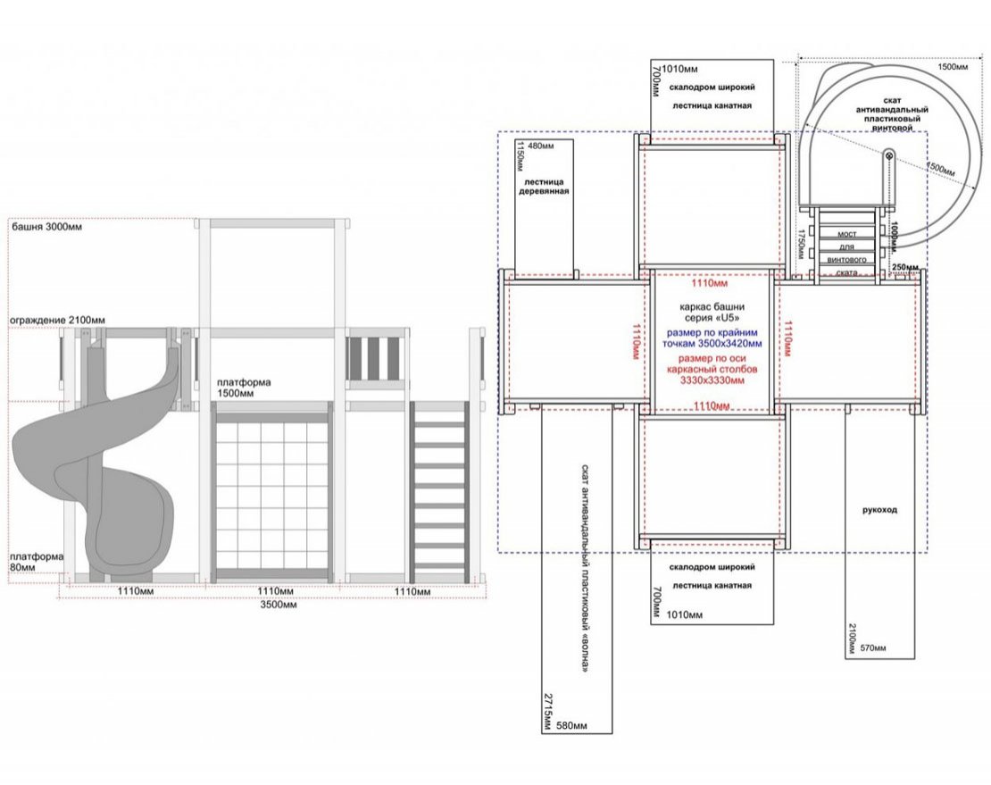 Рекомендованная распределенная единовременная нагрузка: игровая платформа 350кг., статичный мост 350кг., деревянная лестница 100кг., скалодром 150кг., канатная лестница 150кг., скат 150кг.