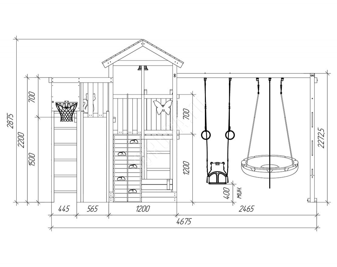 В основе натуральный материал – клееный брус 75х75 мм. Конструкция и элементы качельных подвесов разработаны и произведены согласно ГОСТ.
