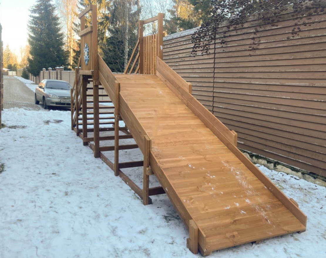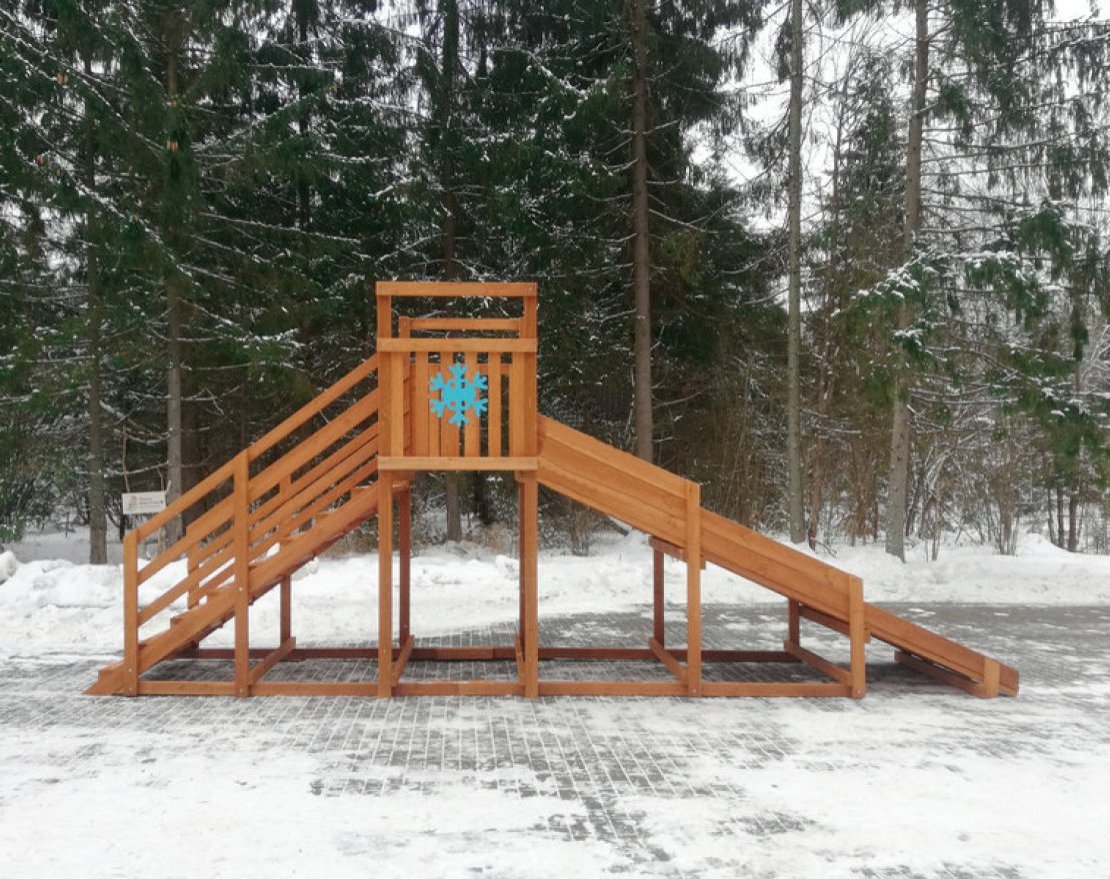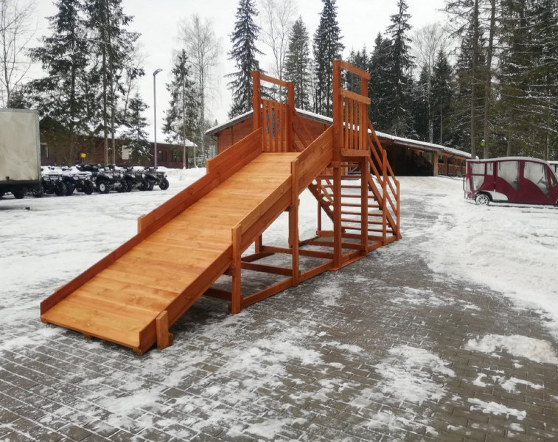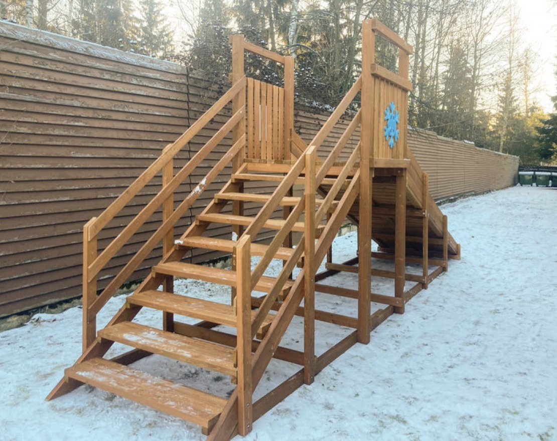 Даже ребята дошкольного возраста смогут самостоятельно взобраться наверх по ступенькам, держась за перила. Небольшая площадка в верхней части позволит детишкам удобно расположиться на ледянке или саночках.