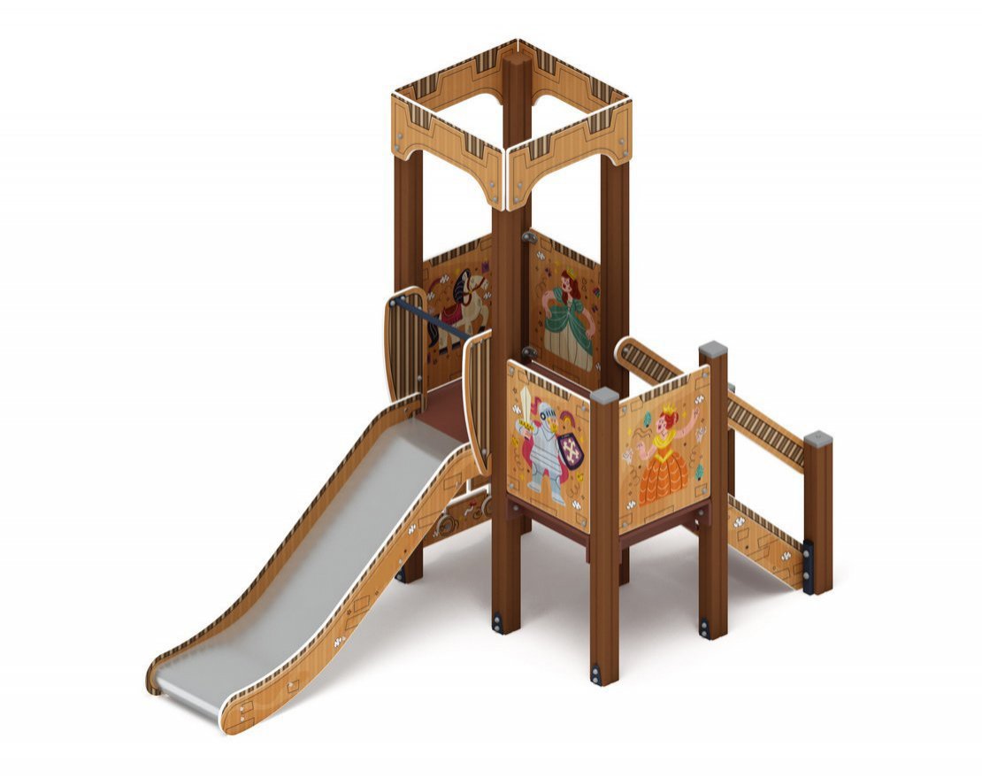Спаренная башня из шести клеёных брусьев 100х100 мм, высота 2500 мм — 4 шт. и 1500 мм — 2 шт.; полы из ламинированной фанеры, с антискользящим покрытием 780х780 мм и толщиной 18 мм. Башня без крыши, украшена стилизованными декоративными арками, кромки фанеры тщательно шлифованы, окрашены с нанесением принта. Отметка пола башни от планировочной отметки площадки 900 мм и 750 мм.