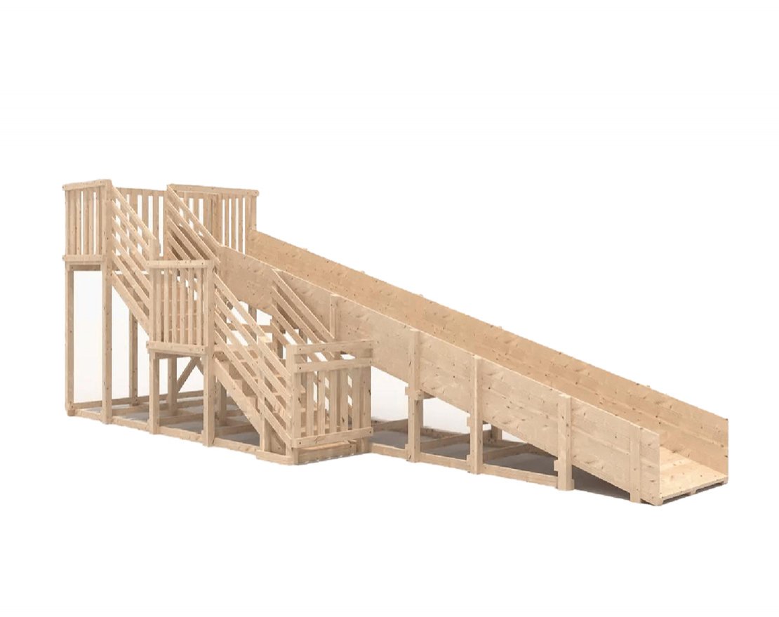 Детская заливная зимняя горка Snow Fox (скат 8 м), без окраски – несущая деревянная конструкция с усиливающими балками. Она имеет скат длиной 8,0 м, а шириной – 1,28 м. Скат достаточно просторный, поэтому ребятам будет удобно с него скатываться в объёмной тёплой одежде. Скат заливается холодной водой при минусовой температуре, после чего горка готова к эксплуатации.