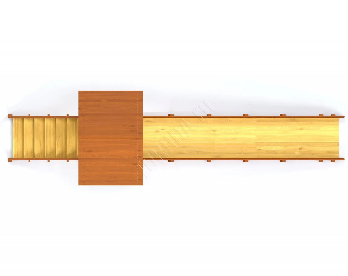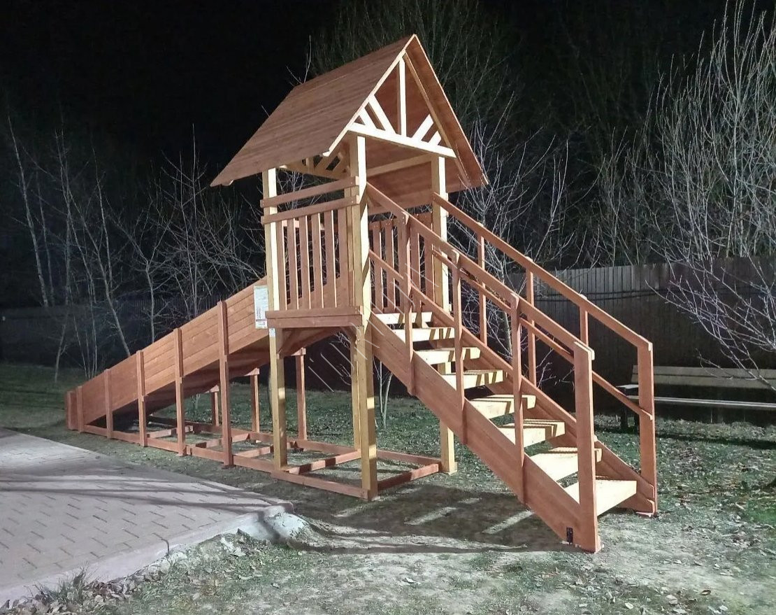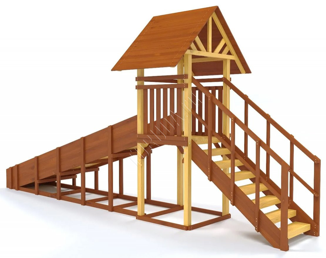 Силовые детали конструкций производены из крепкого клееного бруса с квадратным сечением (сторона 90 мм). Дерево покрыто натуральной краской на водной основе, которая выдерживает перепады температур и при этом абсолютно безопасна для малышей.