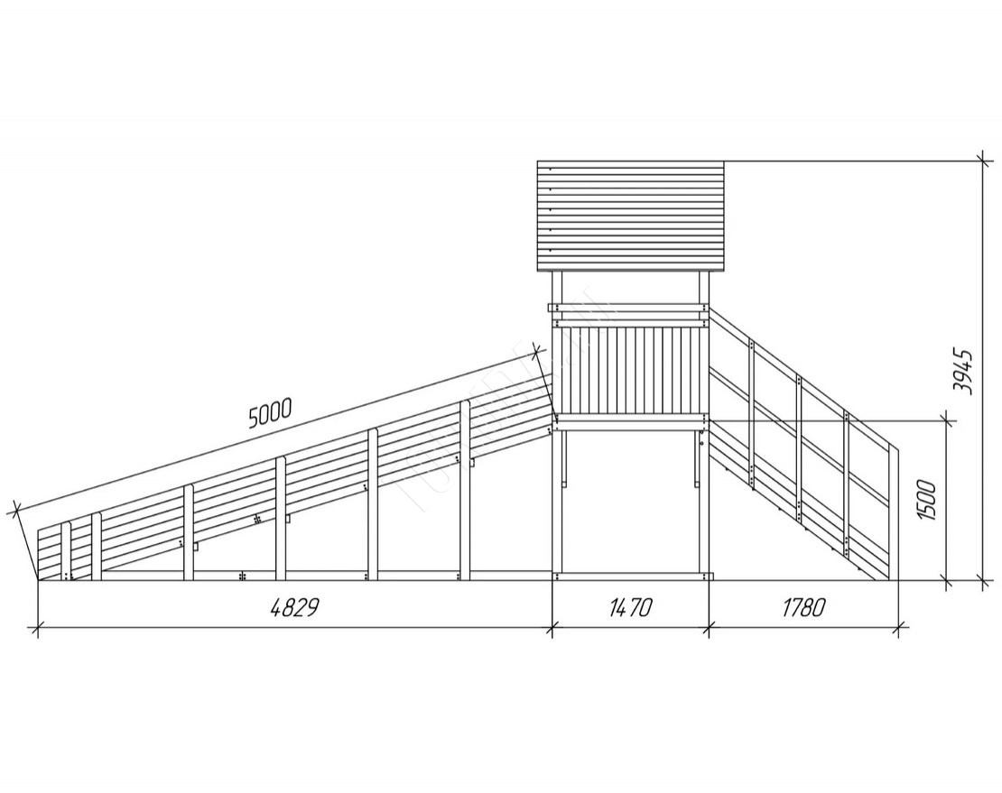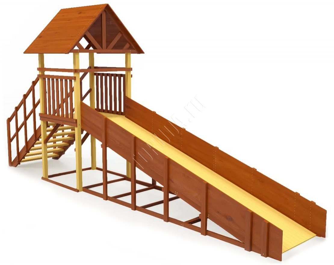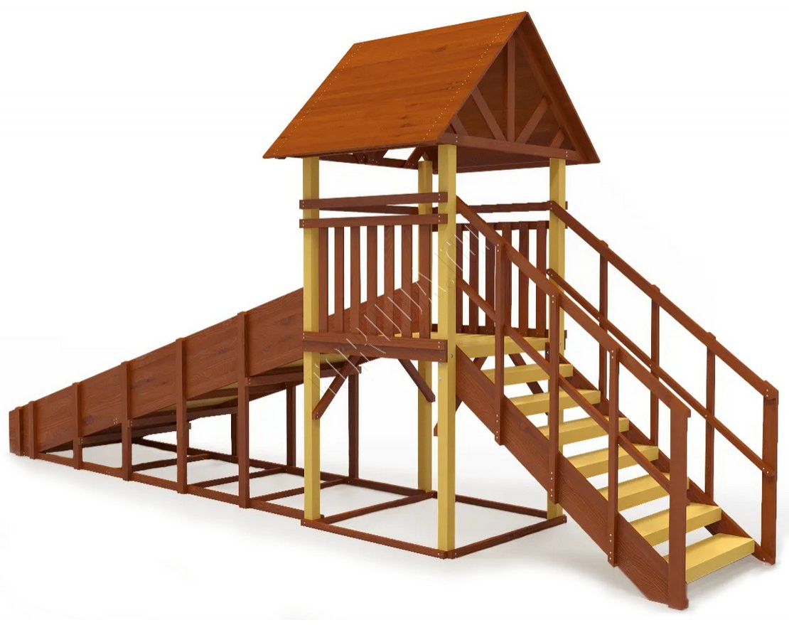 Силовые детали конструкций производены из крепкого клееного бруса с квадратным сечением (сторона 90 мм). Дерево покрыто натуральной краской на водной основе, которая выдерживает перепады температур и при этом абсолютно безопасна для малышей.