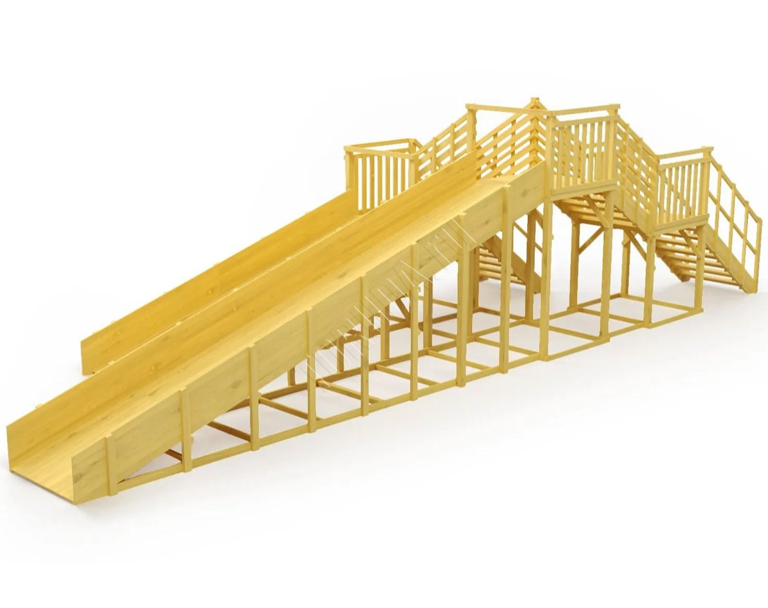 Многоуровневая конструкция с двумя длинными скатами (5 и 7,68 м). Прочный клееный брус делает горку надежной и долговечной.