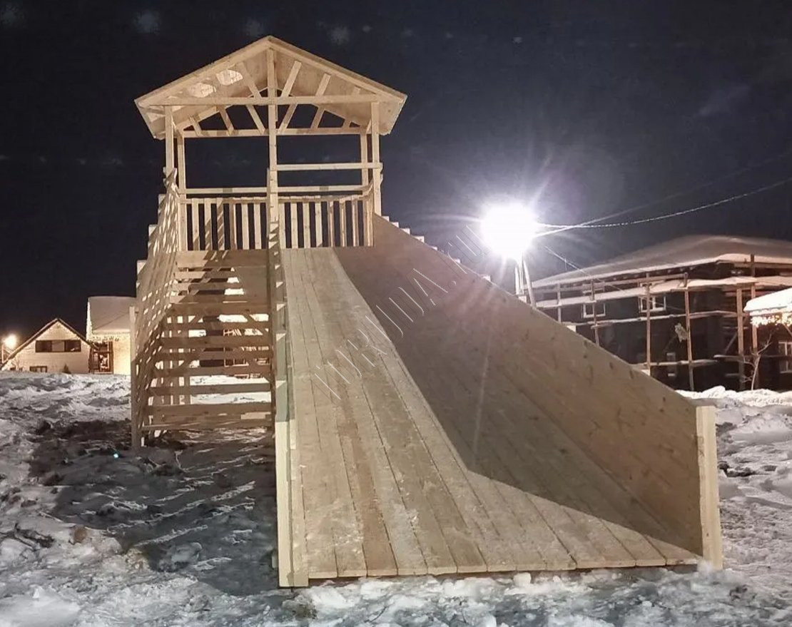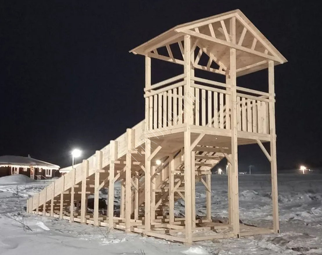 Универсальная деревянная зимняя горка TORUDA Север wood-8/1 – модель с самым длинным скатом из зимней линейки без покраски (9 м).