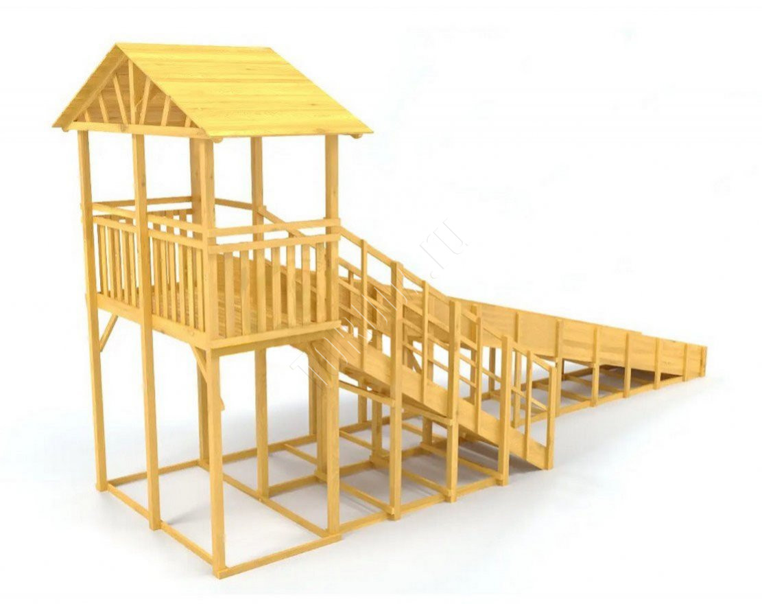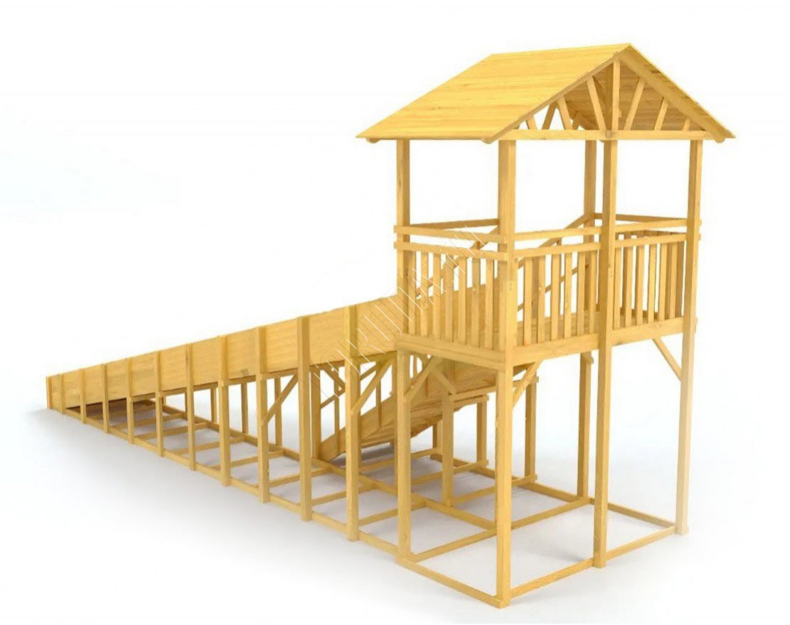 Её каркас сделан из клееного бруса. Он устойчив к влажности, морозу, перепадам температуры, что делает игровой комплекс всепогодным и всесезонным. Также обладает высокой прочностью, сохраняет геометрию в процессе эксплуатации.