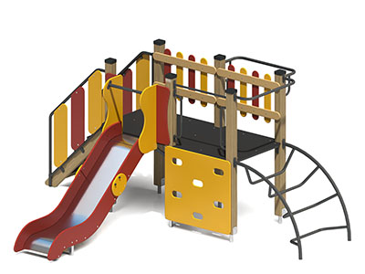 Игровой комплекс представляет собой: сборноразборную, модульную конструкцию, состоящую из восьми опорных столбов, одной площадки, одного лестничного марша, двух перил к лестничному маршу, выполненных в виде скачущих зайцев, одного ската горки с высотой стартового участка 1000мм, одного снаряда «скалолаз» со стойкой для подъема, двух ограждений, выполненных в виде елочек и грибов, одного снаряда для подъема, одного декоративного фанерного лаза с двумя ручками, двух разновысоких навесных турников. На вершины столбов устанавливаются пластиковые заглушки.