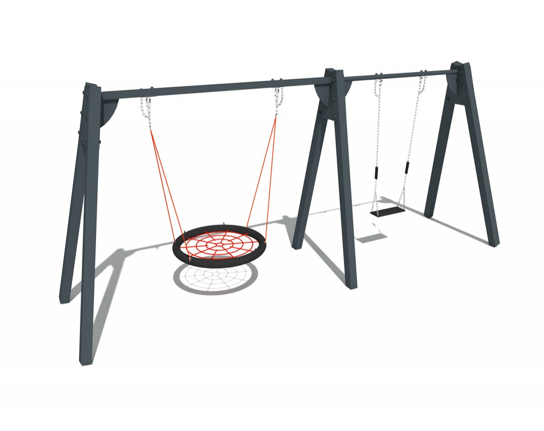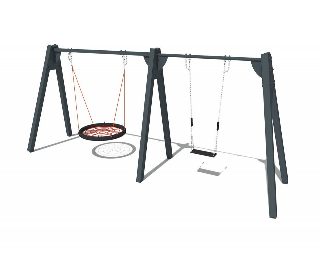 Двойные качели на металлических стойках. Устанавливаются путём бетонирования. Одно из сидений прорезинено, другое – типа «гнездо».