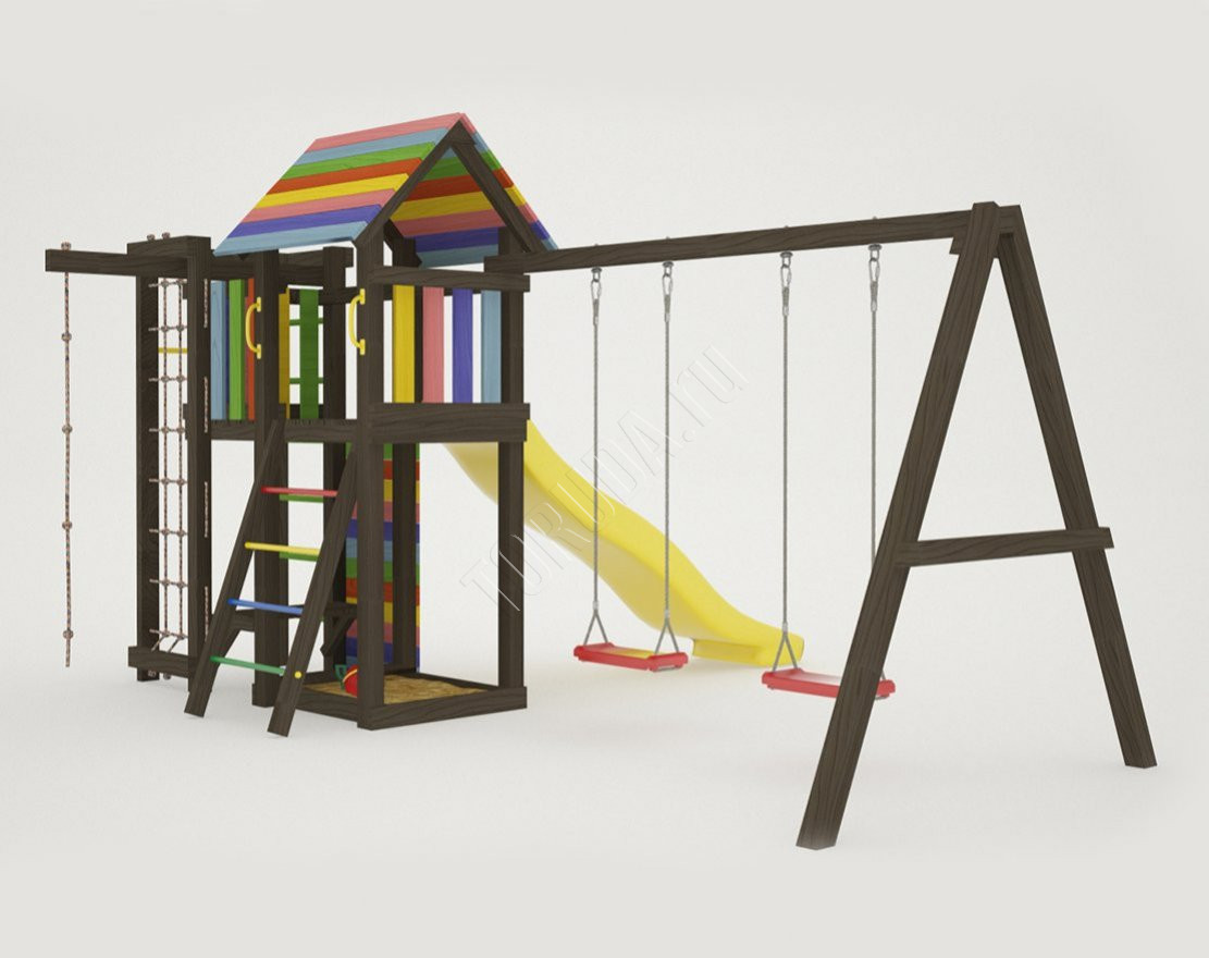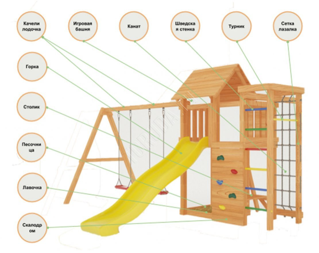 - Это универсальное решение для активного досуга и позитивного настроения непосед с трех лет. Комплекс безопасен – конструкция, качество древесины и подвижных элементов соответствуют ГОСТ. Основным материалом является экологичный клееный брус, балки которого отшлифованы и имеют закругленные края.