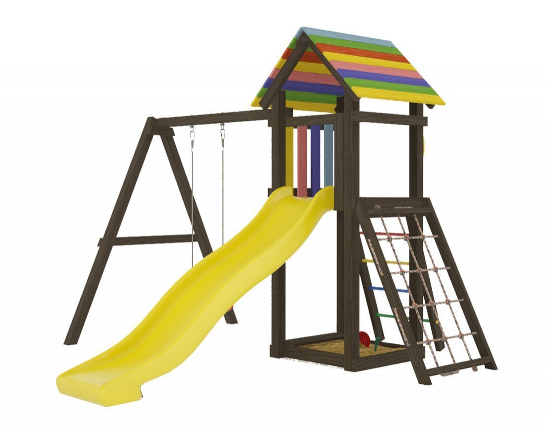 - Домик закрыт сверху деревянным перекрытием – оно скрывает от прямых солнечных лучей и позволяет передохнуть на свежем воздухе. Комплекс универсален, поскольку включает в себя столь любимые детьми горку и качели.