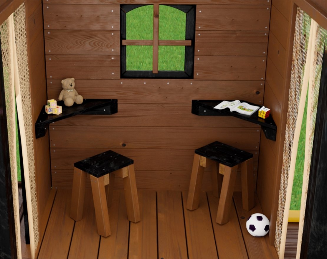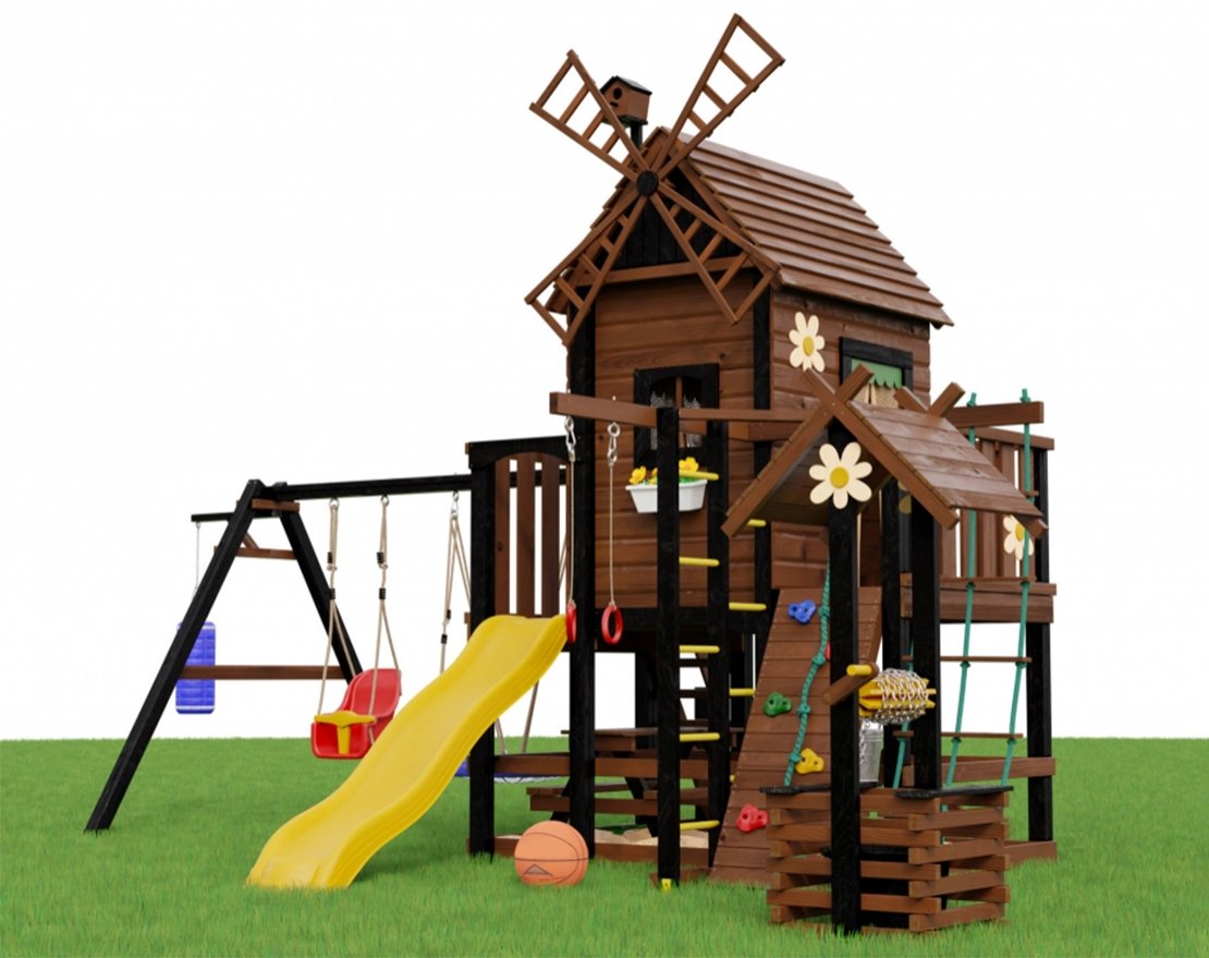 Игровой комплекс Мулен 2 с колодцем — это уютный деревянный домик, наполненный атмосферой приключений. Его узнаваемый силуэт с декоративными лопастями на крыше перенесет детей в мир сказок, где можно представить себя отважным путешественником, хозяином мельницы или капитаном воздушного корабля. Площадка сочетает различные игровые и спортивные элементы, помогая ребенку развивать ловкость, силу и координацию. Лестницы, канаты, качели и горка превращают игру в увлекательное приключение, в котором важно не только фантазировать, но и двигаться. Внутри домика продумано всё до мелочей — каждый уголок наполнен возможностями для игры, творчества и удобства. На втором этаже маленьких художников ждет доска для рисования, где можно воплощать свои фантазии. Два отдельных столика со стульчиками позволяют детям играть, рисовать или устраивать чаепитие, не мешая друг другу. А просторная песочница под домиком станет местом для совместных экспериментов с песочными замками — здесь хватит места всем! Два раздельных входа делают пространство более просторным и удобным, создавая еще больше возможностей для веселой и динамичной игры.