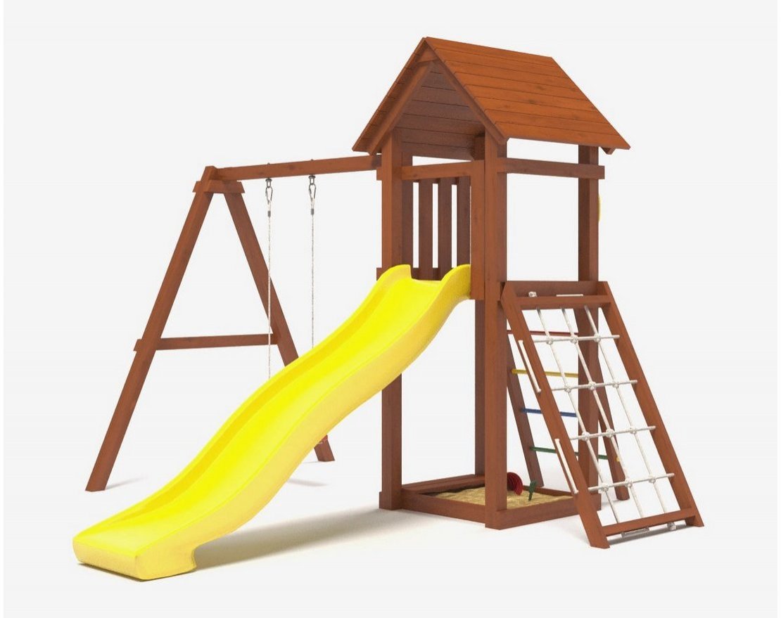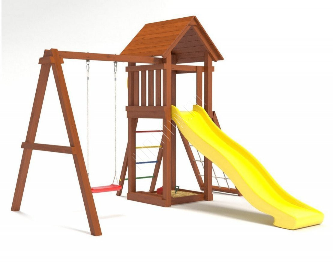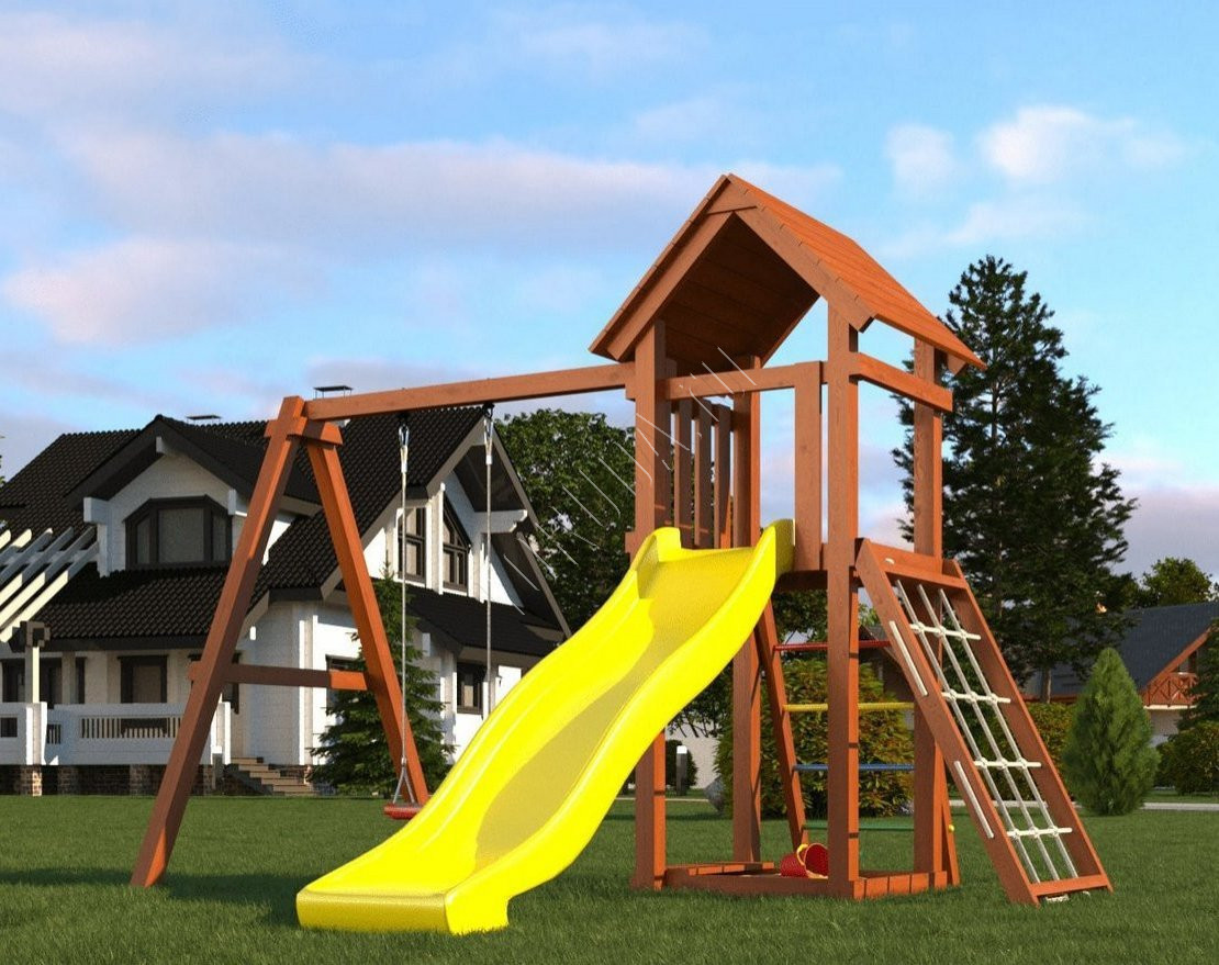 - Домик закрыт сверху деревянным перекрытием – оно скрывает от прямых солнечных лучей и позволяет передохнуть на свежем воздухе. Комплекс универсален, поскольку включает в себя столь любимые детьми горку и качели.