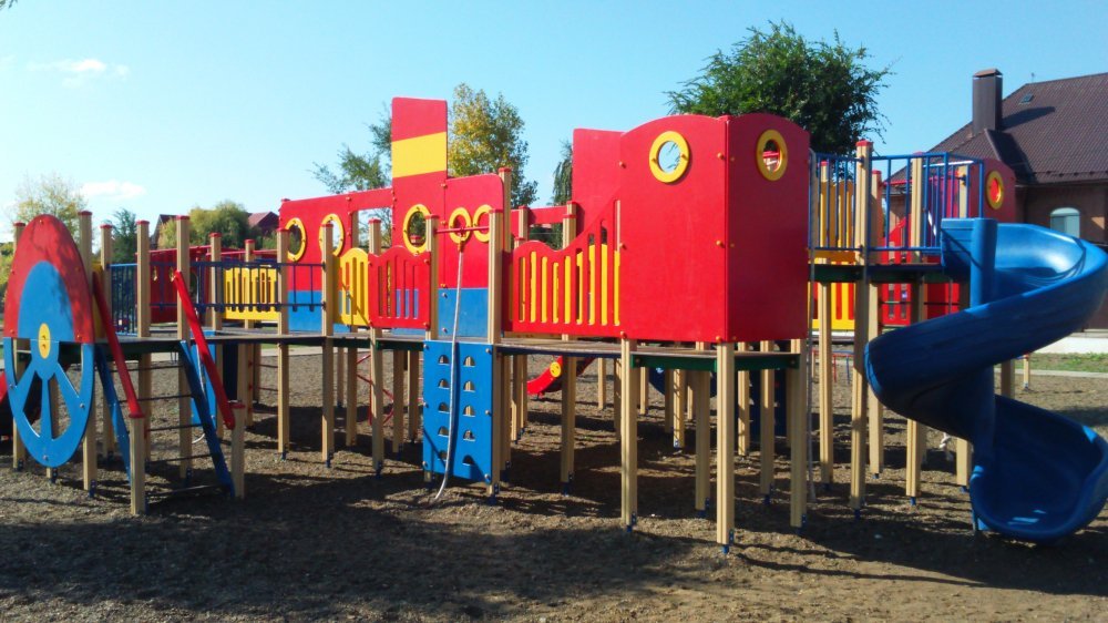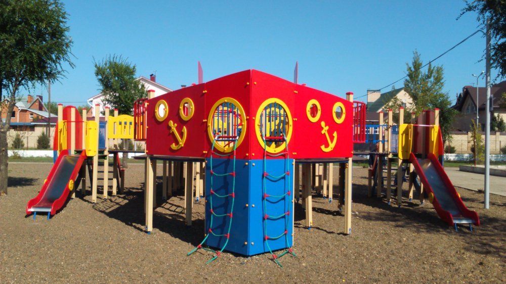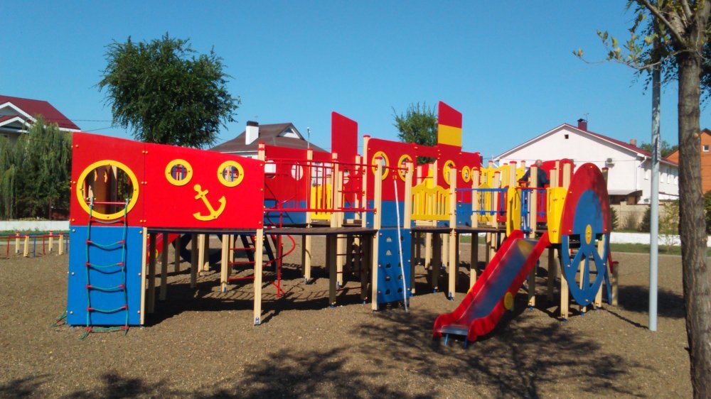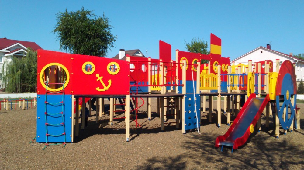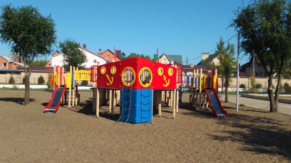 Комплекс стилизован под пароход, имеются декоративные борта, ораждения мостов, различных размеров, накладка якорь. Элементы выполнены из влагостойкой фанеры различных размеров и толщин. Столбы, к которым крепится парус, выполнны из клеёного бруса, окрашенного в коричневый цвет, 100х100 мм. Все элементы отшлифованы и окрашены.
