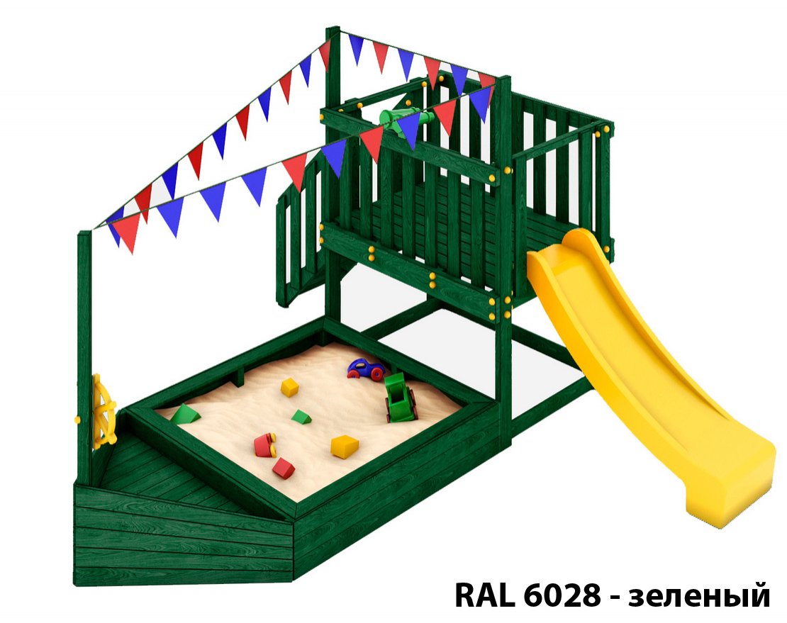 Детская песочница-кораблик и капитанский мостик с горкой с высоты 900 мм с флажками.
