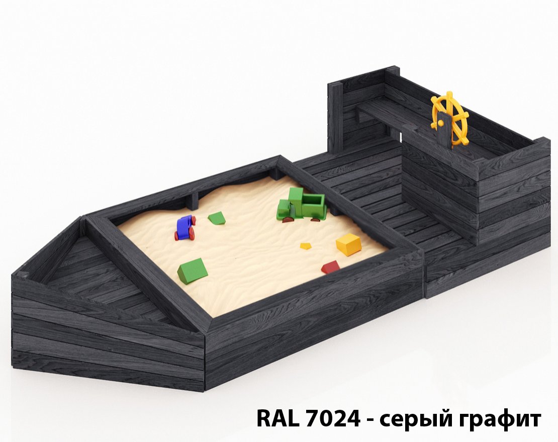 Детская песочница-кораблик и штурманская рубка со штурвалом.