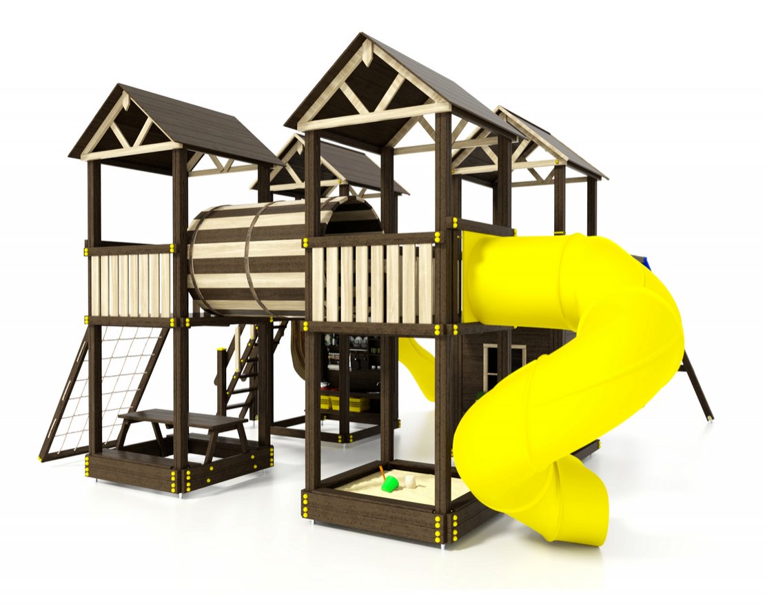 Для максимальной защиты ребёнка от травм, все углы имеют закруглённую форму, крепеж скрыт пластиковыми заглушками. Опоры изготовлены из клеёного бруса толщиной 90*90 мм.