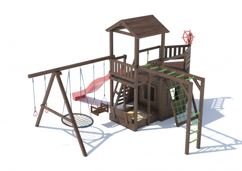 Основа детской игровой - спортивной конструкции - башня с террасой и игровой платформой. Конструкция оснащена двускатной деревянной крышей, пластиковым волнообразным скатом с превосходной скользящей поверхностью, деревянной лестницей, широким скалодромом, канатной лестницей, деревянным рукоходом, приставными качелями, сидениями для качелей, гимнастическими кольцами, штурвалом, встроенным домиком в нижней части конструкции и пристроенной к домику песочницей с крышкой «трансформер». Для безопасности ребенка предусмотрены перила на лестнице, заборчики и ограждения над зонами препятствий (скалодром, канатная лестница, скат).