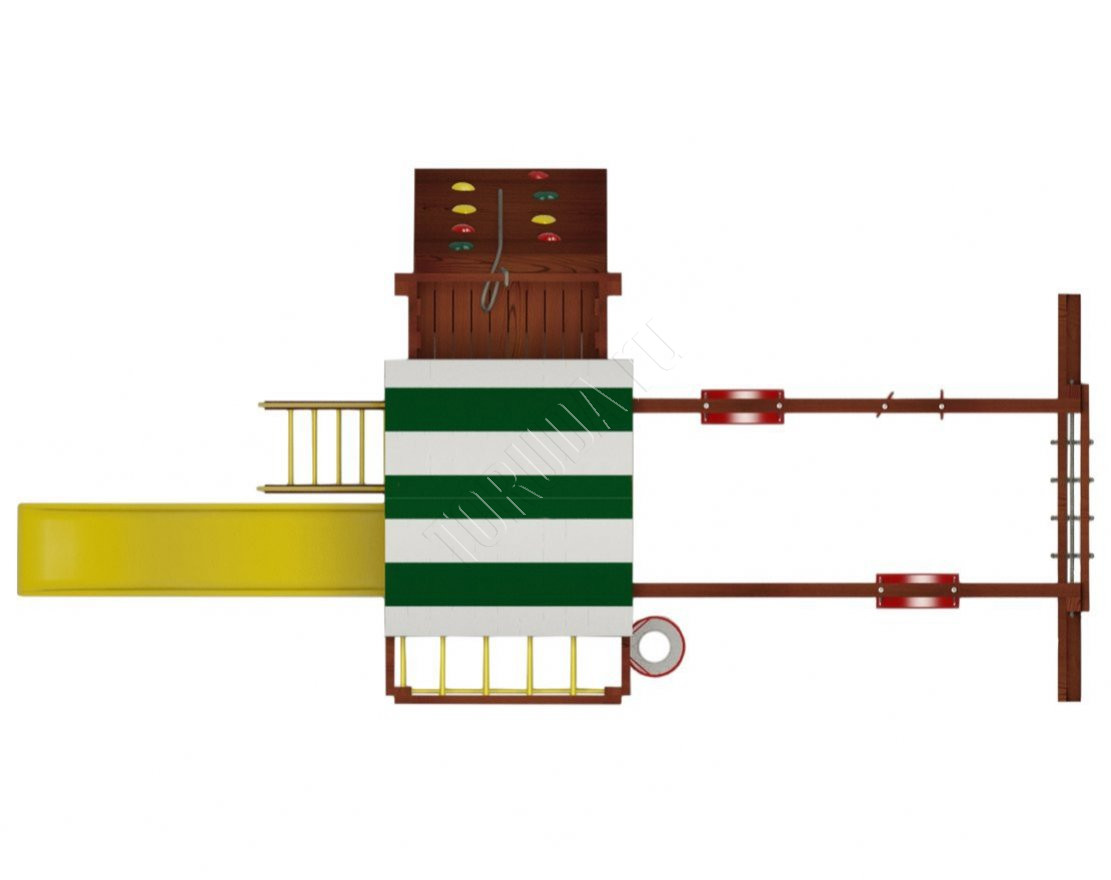 - Безопасность и надёжность: конструкция выполнена из натуральных и экологичных материалов, все соединения надёжно закреплены, а болтовые крепления закрыты пластиковыми заглушками. Это обеспечивает комфортную и безопасную игру на площадке.