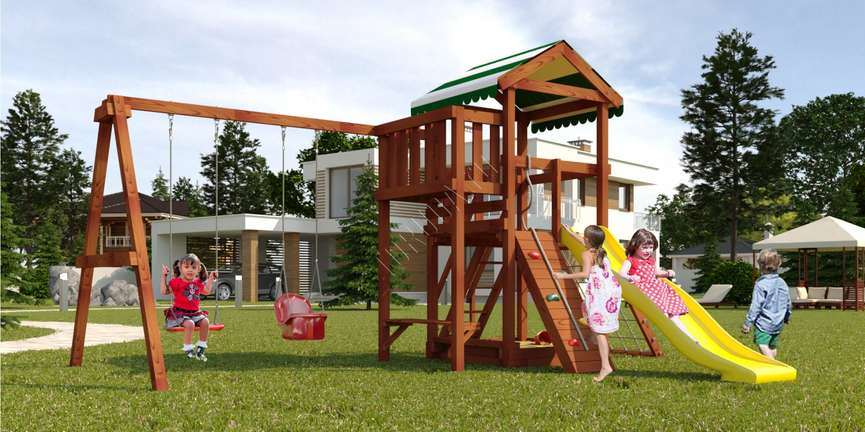 Сбоку к башне крепится качельная рама для двух элементов на выбор, например, качели «Лодочка» и «Люкс» со спинкой. Они очень нравятся как маленьким деткам, так и младшим школьникам.