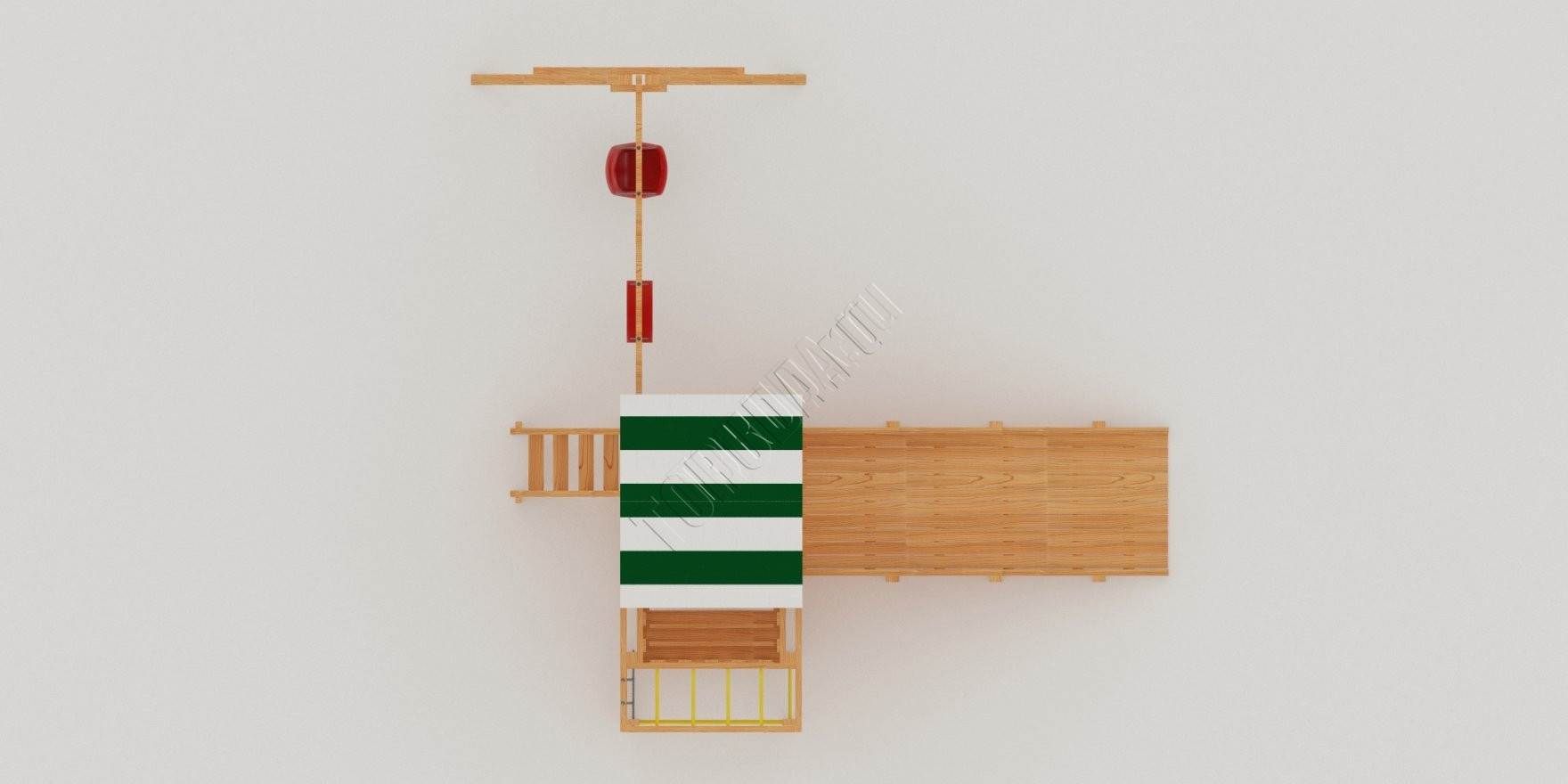 Игровая башня – центр спортивного строения с платформой на уровне 1200 мм от земли. Внизу расположилась песочница размером 1.29 м х 1.29 м и лавочка. В развитии силовых показателей помогут шведская стенка, сетка-лазалка, турник и рукоход.