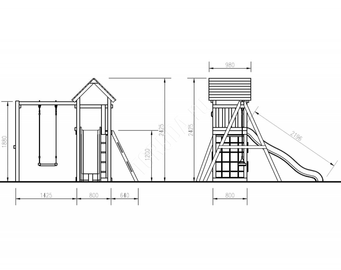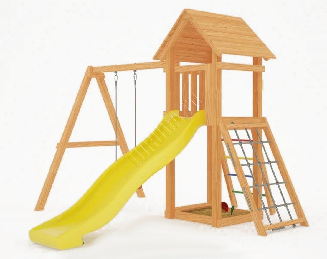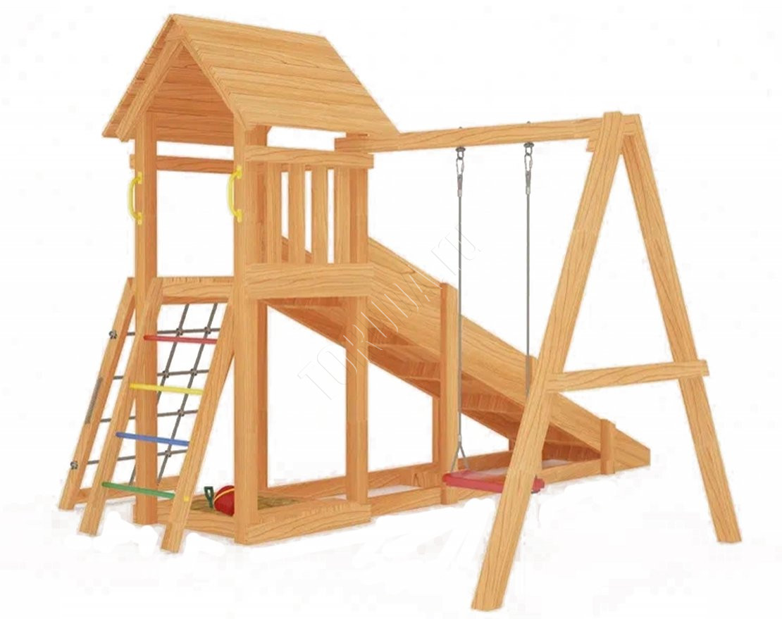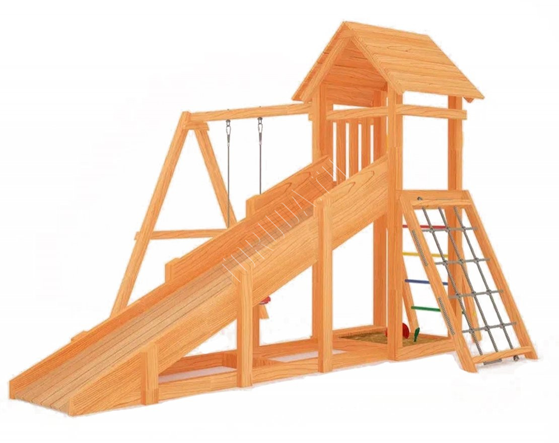 Площадка сохраняет геометрию рамы, содержит натуральные материалы, прошедшие сертификацию. Балки клееного бруса гладкие, острые края скруглены – отсутствие ран и ссадин важнее всего.