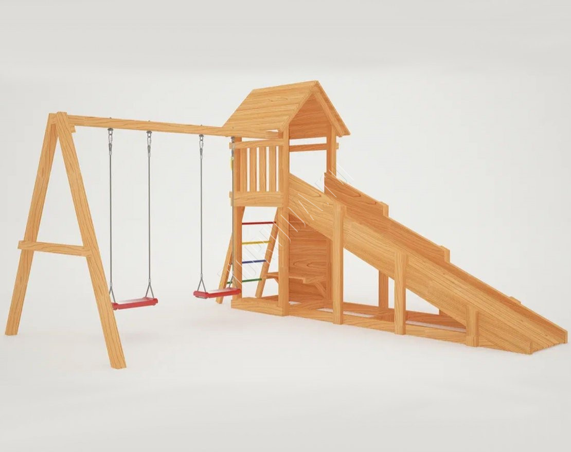Основной материал натуральный и экологичный – это шлифованный клееный брус, края которого скруглены. Занозы и ссадины исключены. Детская площадка безопасна: конструкция рамы произведена согласно ГОСТ, все крепежи закрыты заглушками, а подвесное снаряжение сертифицировано и создано специально для детей в Бельгии.