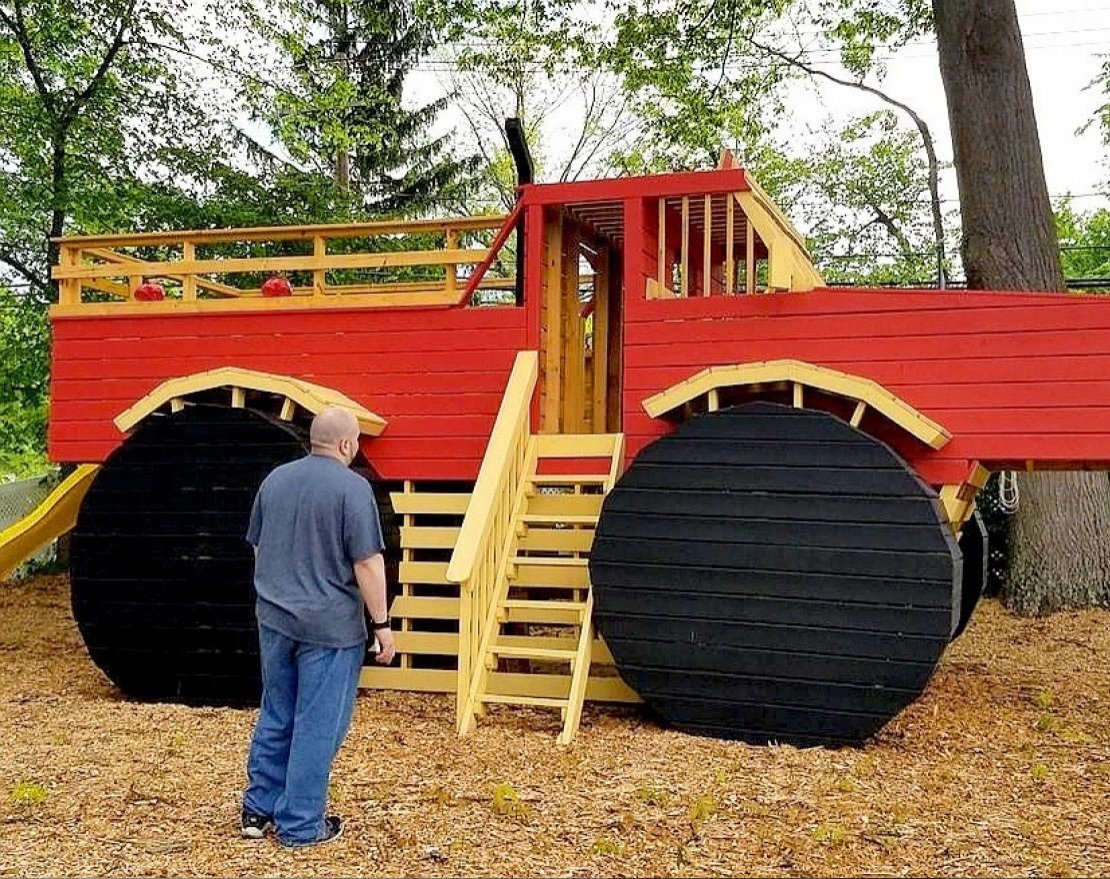 Множество мелких деталей добавляют реализма и радости, которую дети могут получить от этого дизайна. Моторный отсек открыт, чтобы дети могли залезть туда и поиграть. Монстр Трак включает в себя люк, место для горки высотой 183 см, сиденья, педали и другие детали.
