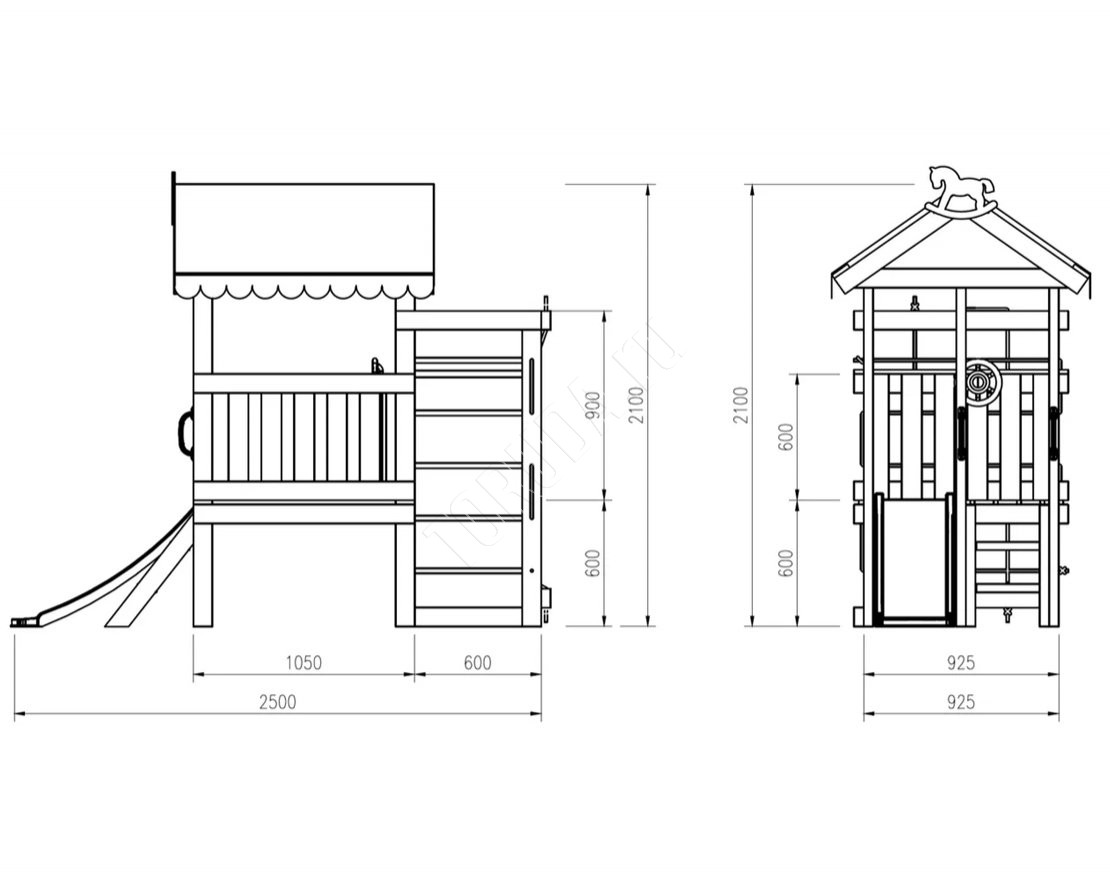 - В игровой зоне на платформе (60 см от пола) расположен домик с крышей. Зайти внутрь ваш ребёнок сможет по удобной, прочной лестнице. Внутри установлен руль-штурвал. Наигравшись наверху, малыш может спуститься обратно вниз, скатившись по яркой пластиковой горке или воспользовавшись лестницей.