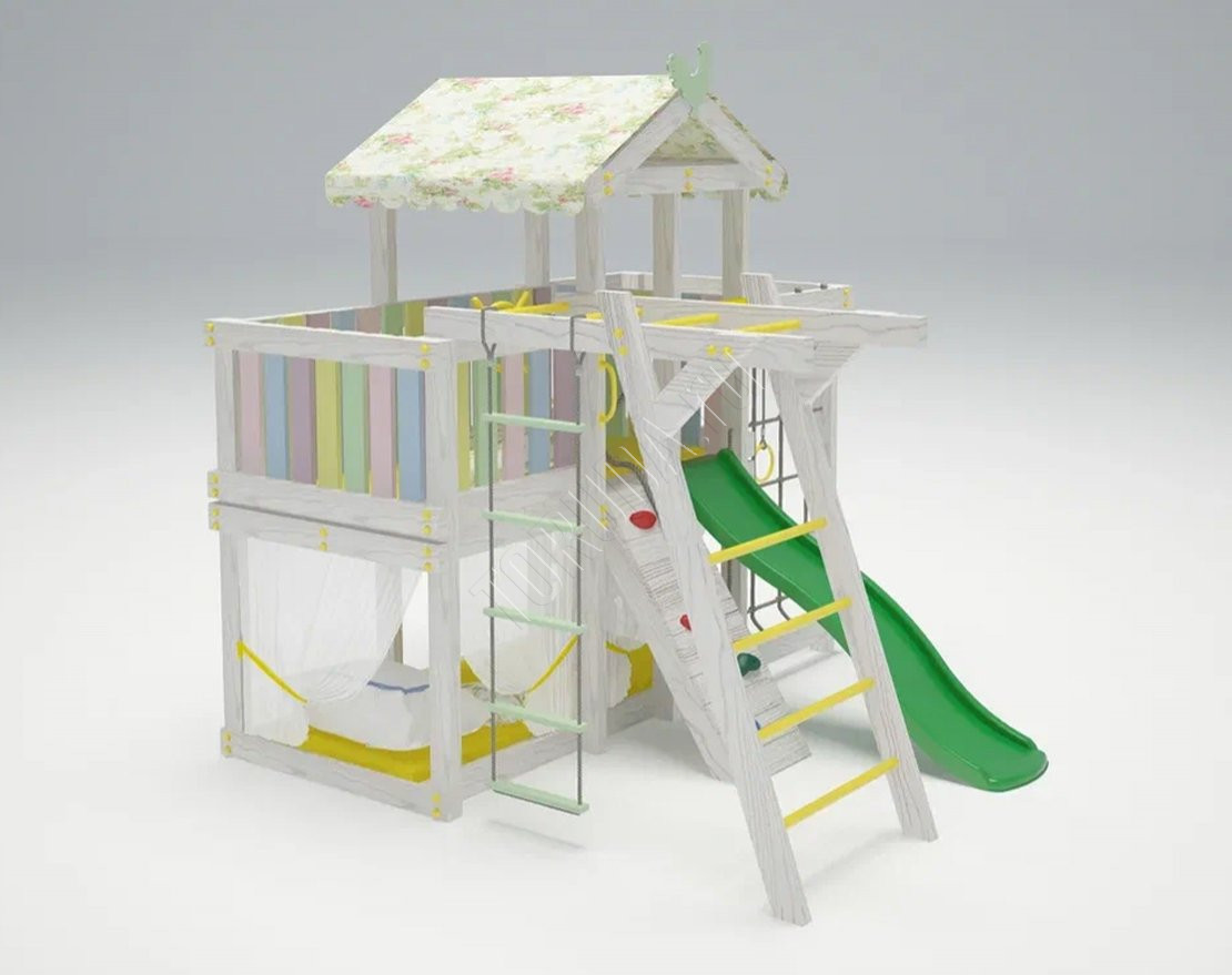 Модель оснащена спортивным оборудованием от ведущих бельгийских производителей. Включает две игровые зоны на разных уровнях, балкон с биноклем и штурвалом. Также в комплекте имеется пластиковая горка, которая всегда вызывает восторг у детей.