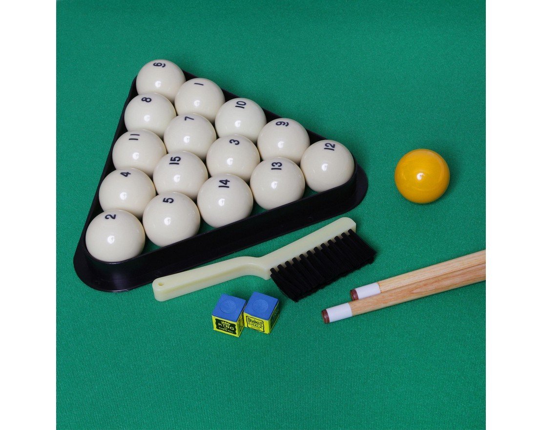 Модель поставляется с комплектом всех необходимых для игры аксессуаров: двусоставные кии (2 шт.), набор из 16-ти шаров, два мела, треугольник и щетка для ухода за поверхностью сукна.