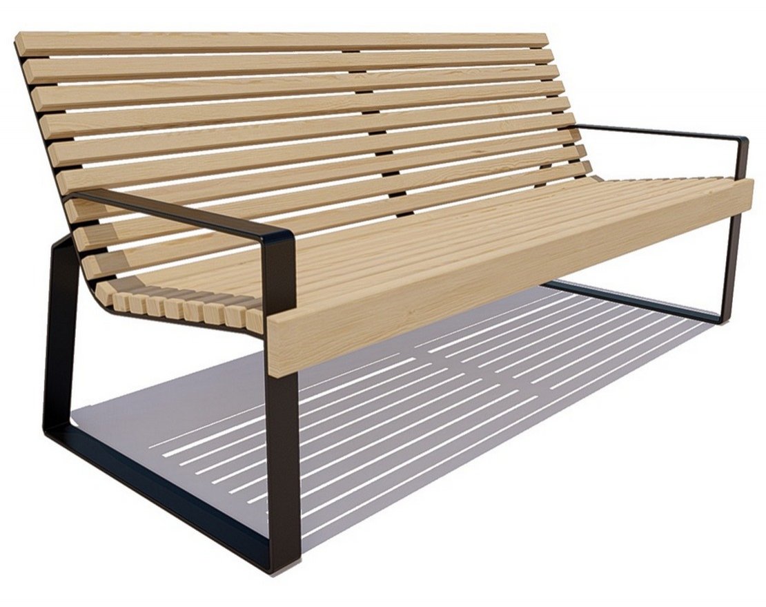 Скамейка Белгород в современном стиле. Минималистичные стальные боковины плавно перетекают в практичные подлокотники. Эргономичные спинки позволяют быстро расслабиться.