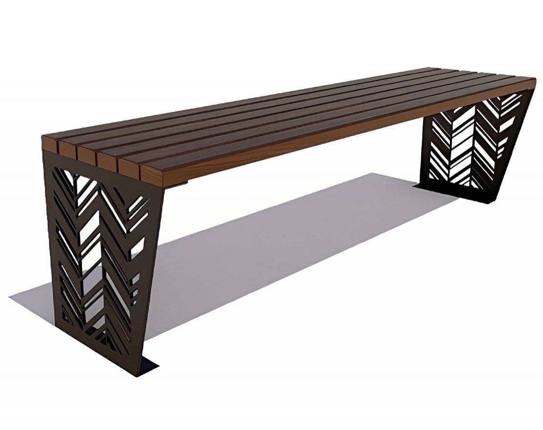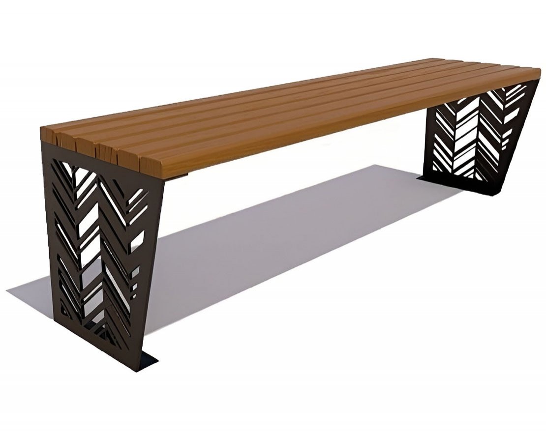 Простая, но прочная банкетка «Гарнизон» без спинки, сделанная на стальном каркасе, имеет геометрический орнамент на боковинах. Сидение выполнено из ангарской сосны. Размеры идеально подходят для небольших улиц и дачных участков.