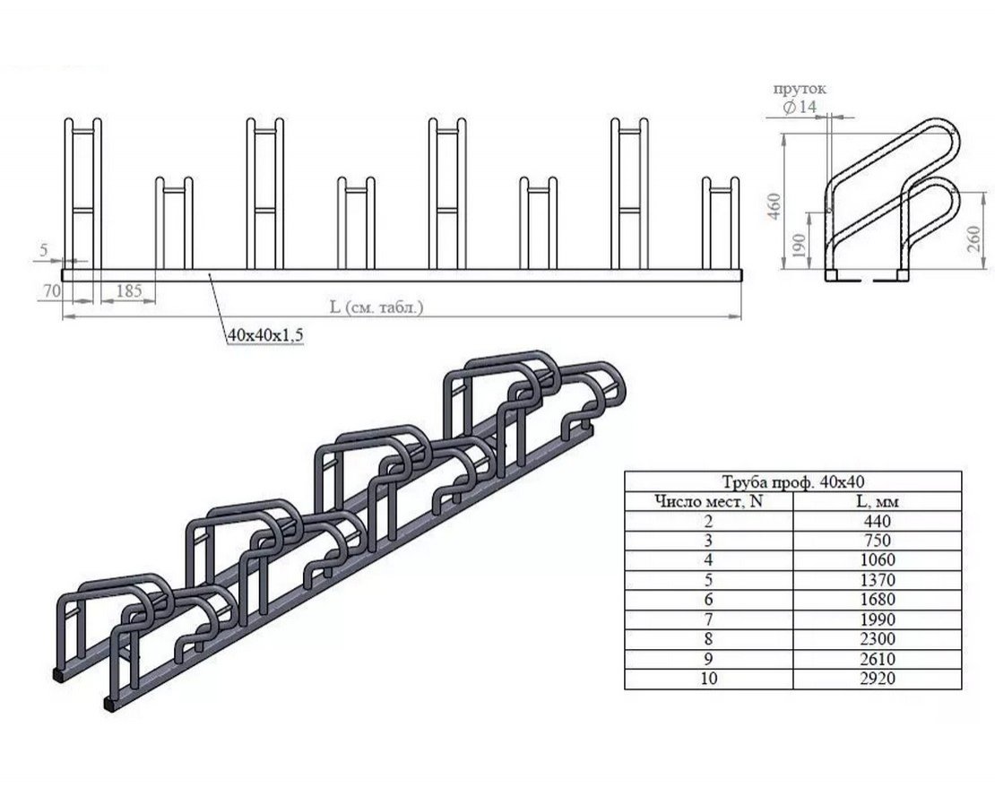 При изготовлении велопарковки на разное количество мест параметры длины: