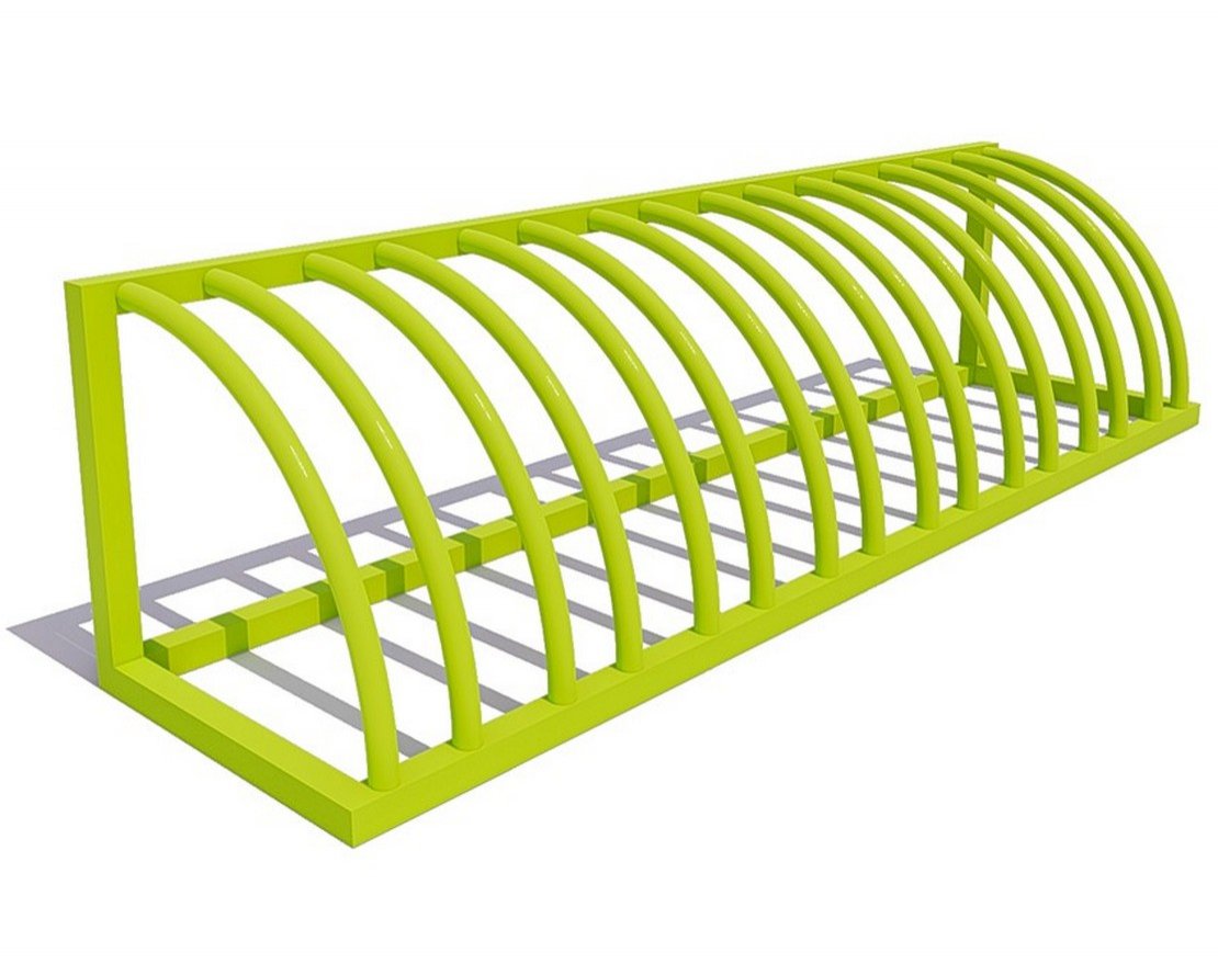 Велопарковка – это стальная конструкция с массивным прямоугольным основанием. Ячейки имеют полукруглую форму, секции для велосипедов чередуются с узкими разделительными блоками. Конструкция отличается небольшими размерами, легко умещается вдоль стен за счет плоской каркасной части сзади и устойчива на любой поверхности. Для окраски используется специальное износоустойчивое покрытие. Сплошные элементы отсутствуют, поверхность легко моется и не выцветает на солнце. За счет массивного основания парковка не требует закрепления, практична и удобна в использовании.