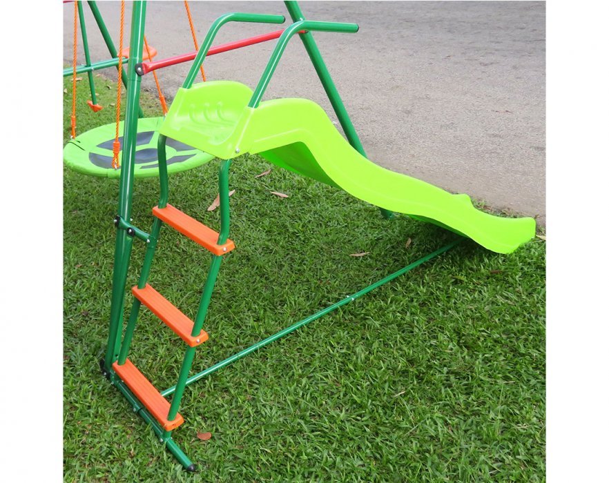 Спускной желоб и сидение качелей изготовлены из пластика.