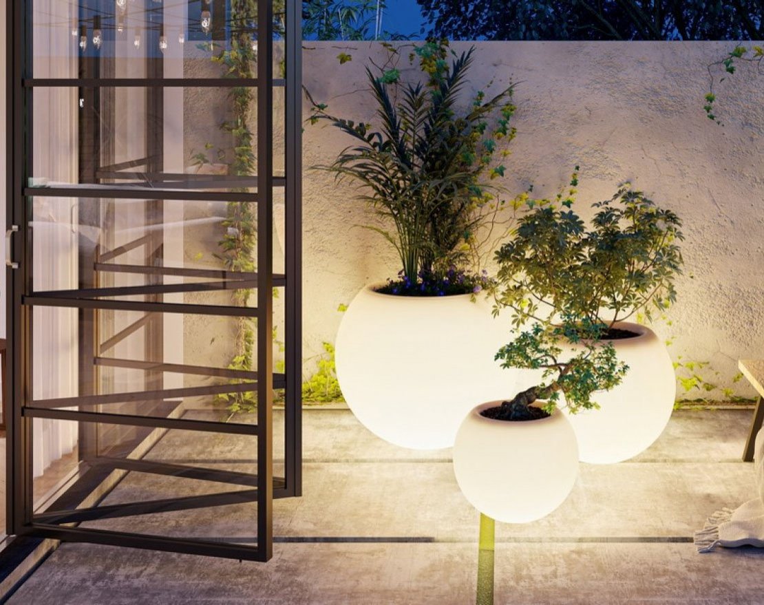 Круглое кашпо с подсветкой Sphere S — это декоративное изделие для выращивания растений, цветов и деревьев, имеющее корпус из полиэтилена низкого давления и расположенный в нижней части светодиодный элемент.